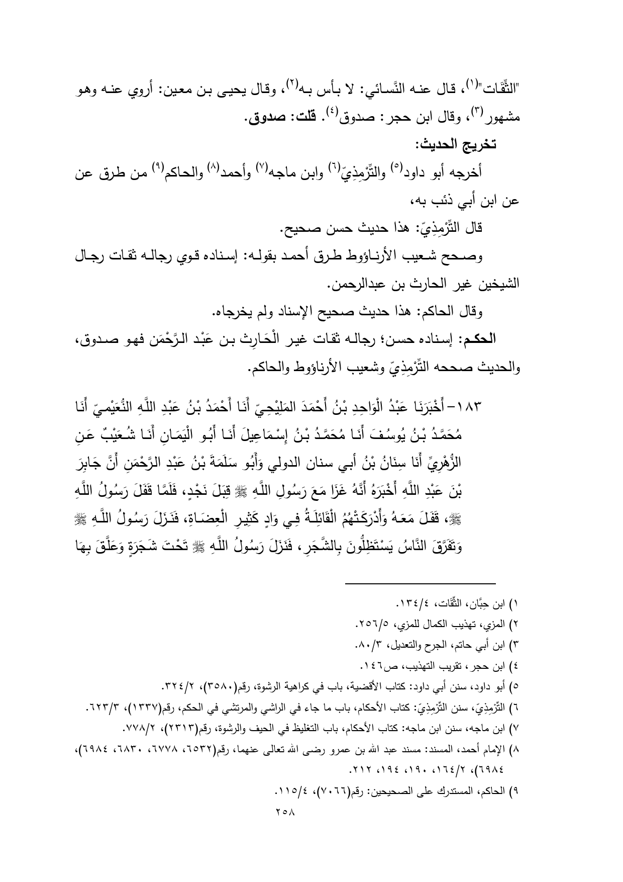 183 - أَخْبَرَنَا عَبْدُ الْوَاحِدِ بْنُ أَحْمَدَ المَلِيْحِيّ أَنَا أَحْمَدُ بْنُ عَبْدِ اللَّهِ النُّعَيْميّ أَنَا مُحَمَّدُ بْنُ يُوسُفَ أَنَا مُحَمَّدُ بْنُ إِسْمَاعِيلَ أَنَا أَبُو الْيَمَانِ أَنَا شُعَيْبٌ عَنِ الزُّهْرِيِّ أَنَا سِنَانُ بْنُ أبي سنان الدولي وَأَبُو سَلَمَةَ بْنُ عَبْدِ الرَّحْمَنِ أَنَّ جَابِرَ بْنَ عَبْدِ اللَّهِ أَخْبَرَهُ أَنَّهُ غَزَا مَعَ رَسُولِ اللَّهِ - صلى الله عليه وسلم - قِبَلَ نَجْدٍ، فَلَمَّا قَفَلَ رَسُولُ اللَّهِ - صلى الله عليه وسلم -، قَفَلَ مَعَهُ وَأَدْرَكَتْهُمُ الْقَائِلَةُ فِي وَادٍ كَثِيرِ الْعِضَاةِ، فَنَزَلَ رَسُولُ اللَّهِ - صلى الله عليه وسلم - وَتَفَرَّقَ النَّاسُ يَسْتَظِلُّونَ بِالشَّجَرِ، فَنَزَلَ رَسُولُ اللَّهِ - صلى الله عليه وسلم - تَحْتَ شَجَرَةٍ وَعَلَّقَ بِهَا