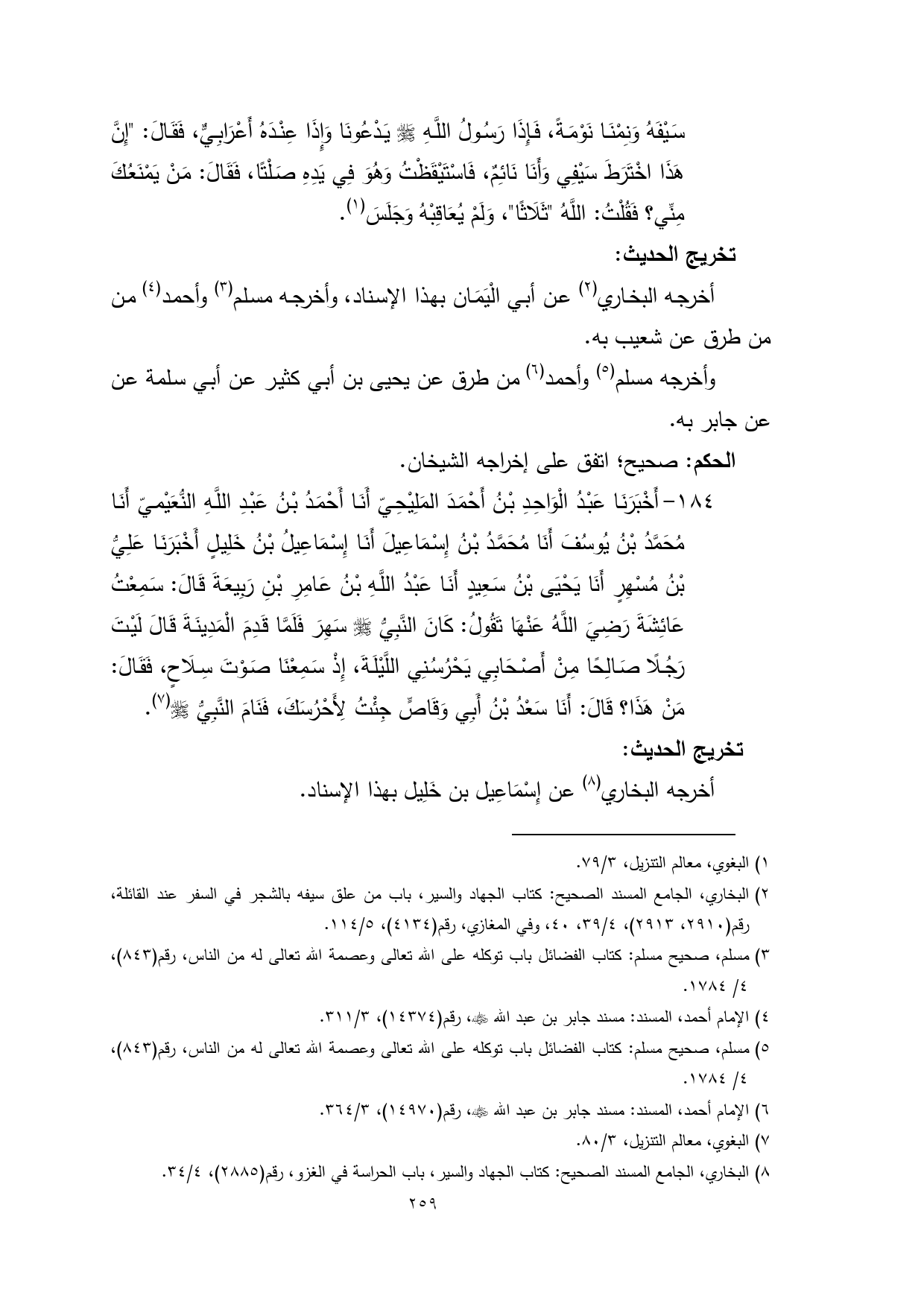 (¬2) البخاري، الجامع المسند الصحيح: كتاب الجهاد والسير، باب من علق سيفه بالشجر في السفر عند القائلة، رقم (2910، 2913)، 4/ 39، 40، وفي المغازي، رقم (4134)، 5/ 114.