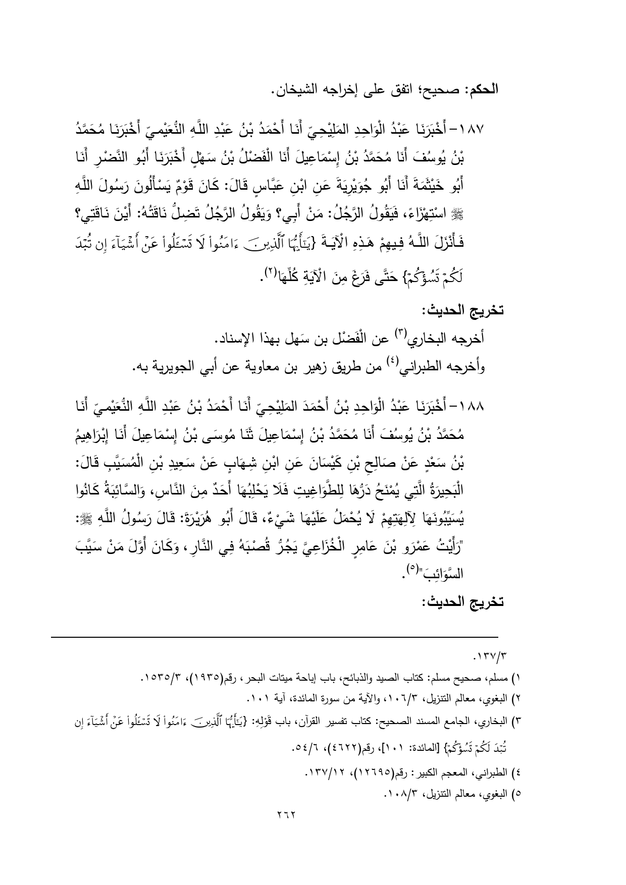 187 - أَخْبَرَنَا عَبْدُ الْوَاحِدِ المَلِيْحِيّ أَنَا أَحْمَدُ بْنُ عَبْدِ اللَّهِ النُّعَيْميّ أَخْبَرَنَا مُحَمَّدُ بْنُ يُوسُفَ أَنَا مُحَمَّدُ بْنُ إِسْمَاعِيلَ أَنَا الْفَضْلُ بْنُ سَهْلٍ أَخْبَرَنَا أَبُو النَّضْرِ أَنَا أَبُو خَيْثَمَةَ أَنَا أَبُو جُوَيْرِيَةَ عَنِ ابْنِ عَبَّاسٍ قَالَ: كَانَ قَوْمٌ يَسْأَلُونَ رَسُولَ اللَّهِ - صلى الله عليه وسلم - اسْتِهْزَاءً، فَيَقُولُ الرَّجُلُ: مَنْ أَبِي؟ وَيَقُولُ الرَّجُلُ تَضِلُّ نَاقَتُهُ: أَيْنَ نَاقَتِي؟ فَأَنْزَلَ اللَّهُ فِيهِمْ هَذِهِ الْآيَةَ {يَا أَيُّهَا الَّذِينَ آَمَنُوا لَا تَسْأَلُوا عَنْ أَشْيَاءَ إِنْ تُبْدَ لَكُمْ تَسُؤْكُمْ} حَتَّى فَرَغَ مِنَ الْآيَةِ كُلِّهَا (¬1).