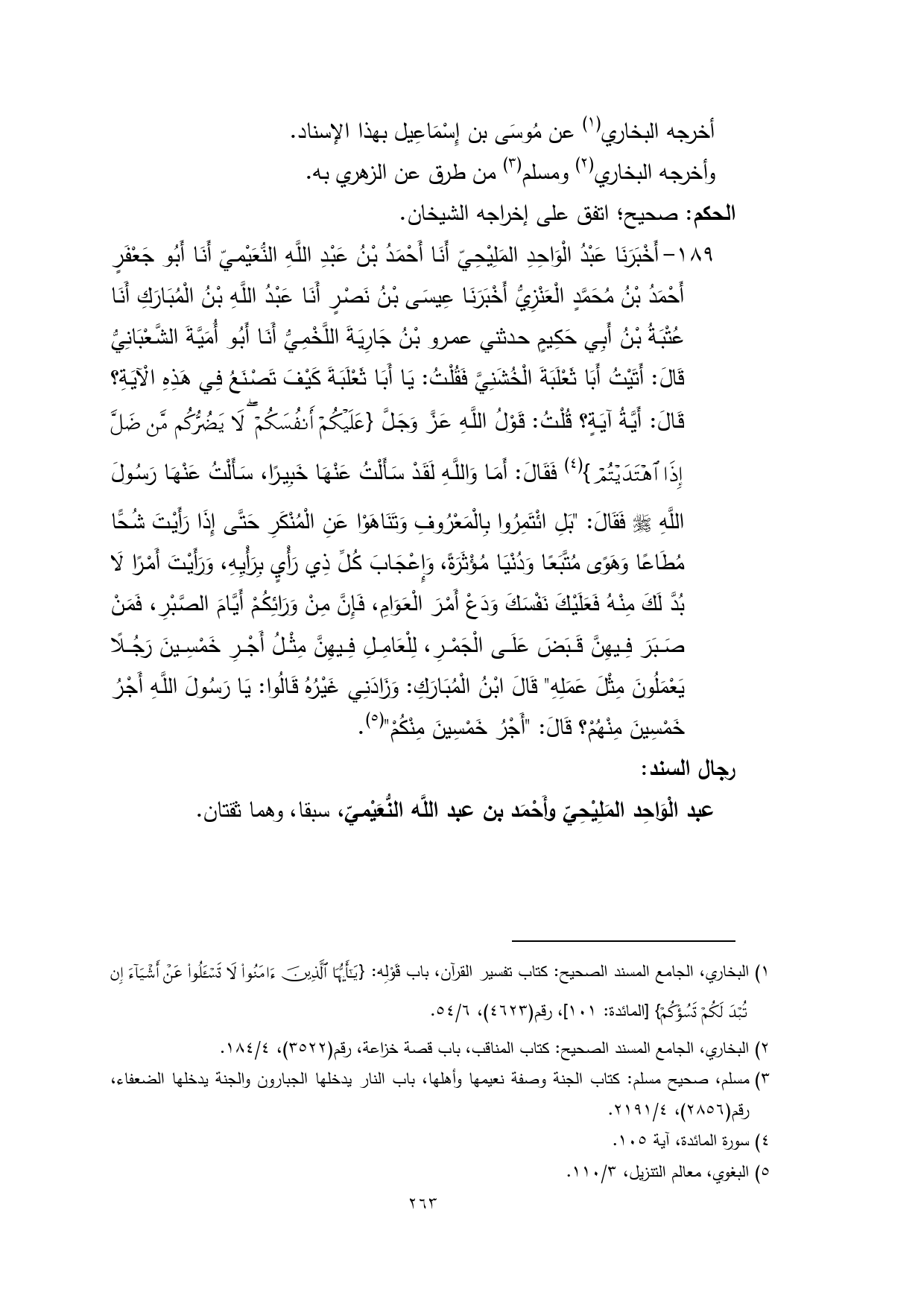 189 - أَخْبَرَنَا عَبْدُ الْوَاحِدِ المَلِيْحِيّ أَنَا أَحْمَدُ بْنُ عَبْدِ اللَّهِ النُّعَيْميّ أَنَا أَبُو جَعْفَرٍ أَحْمَدُ بْنُ مُحَمَّدٍ الْعَنْزِيُّ أَخْبَرَنَا عِيسَى بْنُ نَصْرٍ أَنَا عَبْدُ اللَّهِ بْنُ الْمُبَارَكِ أَنَا عُتْبَةُ بْنُ أَبِي حَكِيمٍ حدثني عمرو بْنُ جَارِيَةَ اللَّخْمِيُّ أَنَا أَبُو أُمَيَّةَ الشَّعْبَانِيُّ قَالَ: أَتَيْتُ أَبَا ثَعْلَبَةَ الْخُشَنِيَّ فَقُلْتُ: يَا أَبَا ثَعْلَبَةَ كَيْفَ تَصْنَعُ فِي هَذِهِ الْآيَةِ؟ قَالَ: أَيَّةُ آيَةٍ؟ قُلْتُ: قَوْلُ اللَّهِ عَزَّ وَجَلَّ {عَلَيْكُمْ أَنْفُسَكُمْ لَا يَضُرُّكُمْ مَنْ ضَلَّ إِذَا اهْتَدَيْتُمْ} (¬4) فَقَالَ: أَمَا وَاللَّهِ لَقَدْ سَأَلْتُ عَنْهَا خَبِيرًا، سَأَلْتُ عَنْهَا رَسُولَ اللَّهِ - صلى الله عليه وسلم - فَقَالَ: "بَلِ ائْتَمِرُوا بِالْمَعْرُوفِ وَتَنَاهَوْا عَنِ الْمُنْكَرِ حَتَّى إِذَا رَأَيْتَ شُحًّا مُطَاعًا وَهَوًى مُتَّبَعًا وَدُنْيَا مُؤْثَرَةً، وَإِعْجَابَ كُلِّ ذِي رَأْيٍ بِرَأْيِهِ، وَرَأَيْتَ أَمْرًا لَا بُدَّ لَكَ مِنْهُ فَعَلَيْكَ نَفْسَكَ وَدَعْ أَمْرَ الْعَوَامِ، فَإِنَّ مِنْ وَرَائِكُمْ أَيَّامَ الصَّبْرِ، فَمَنْ صَبَرَ فِيهِنَّ قَبَضَ عَلَى الْجَمْرِ، لِلْعَامِلِ فِيهِنَّ مِثْلُ أَجْرِ خَمْسِينَ رَجُلًا يَعْمَلُونَ مِثْلَ عَمَلِهِ" قَالَ ابْنُ الْمُبَارَكِ: وَزَادَنِي غَيْرُهُ قَالُوا: يَا رَسُولَ اللَّهِ أَجْرُ خَمْسِينَ مِنْهُمْ؟ قَالَ: "أَجْرُ خَمْسِينَ مِنْكُمْ" (¬5).