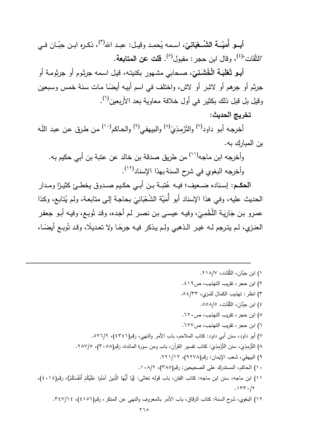 أبو أُمَيَّة الشَّعْبَانِيّ، اسمه يُحمِد وقيل: عبد الله (¬1)، ذكره ابن حِبَّان في "الثِّقَات" (¬2)، وقال ابن حجر: مقبول (¬3). قلت عن المتابعة.