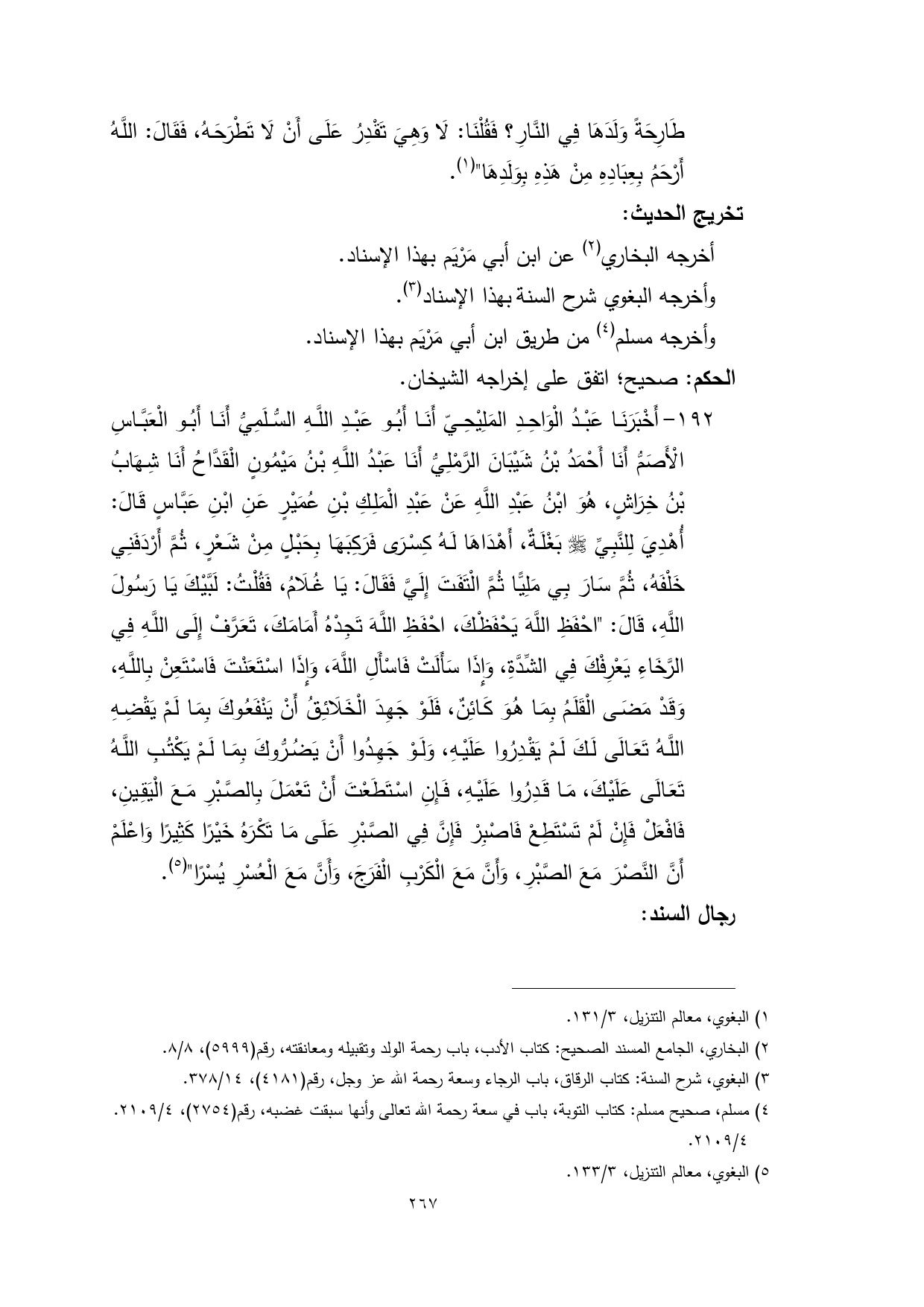 192 - أَخْبَرَنَا عَبْدُ الْوَاحِدِ المَلِيْحِيّ أَنَا أَبُو عَبْدِ اللَّهِ السُّلَمِيُّ أَنَا أَبُو الْعَبَّاسِ الْأَصَمُّ أَنَا أَحْمَدُ بْنُ شَيْبَانَ الرَّمْلِيُّ أَنَا عَبْدُ اللَّهِ بْنُ مَيْمُونٍ الْقَدَّاحُ أَنَا شِهَابُ بْنُ خِرَاشٍ، هُوَ ابْنُ عَبْدِ اللَّهِ عَنْ عَبْدِ الْمَلِكِ بْنِ عُمَيْرٍ عَنِ ابْنِ عَبَّاسٍ قَالَ: أُهْدِيَ لِلنَّبِيِّ - صلى الله عليه وسلم - بَغْلَةٌ، أَهْدَاهَا لَهُ كِسْرَى فَرَكِبَهَا بِحَبْلٍ مِنْ شَعْرٍ، ثُمَّ أَرْدَفَنِي خَلْفَهُ، ثُمَّ سَارَ بِي مَلِيًّا ثُمَّ الْتَفَتَ إِلَيَّ فَقَالَ: يَا غُلَامُ، فَقُلْتُ: لَبَّيْكَ يَا رَسُولَ اللَّهِ، قَالَ: "احْفَظِ اللَّهَ يَحْفَظْكَ، احْفَظِ اللَّهَ تَجِدْهُ أَمَامَكَ، تَعَرَّفْ إِلَى اللَّهِ فِي الرَّخَاءِ يَعْرِفْكَ فِي الشِّدَّةِ، وَإِذَا سَأَلَتْ فَاسْأَلِ اللَّهَ، وَإِذَا اسْتَعَنْتَ فَاسْتَعِنْ بِاللَّهِ، وَقَدْ مَضَى الْقَلَمُ بِمَا هُوَ كَائِنٌ، فَلَوْ جَهِدَ الْخَلَائِقُ أَنْ يَنْفَعُوكَ بِمَا لَمْ يَقْضِهِ اللَّهُ تَعَالَى لَكَ لَمْ يَقْدِرُوا عَلَيْهِ، وَلَوْ جَهِدُوا أَنْ يَضُرُّوكَ بِمَا لَمْ يَكْتُبِ اللَّهُ تَعَالَى عَلَيْكَ، مَا قَدِرُوا عَلَيْهِ، فَإِنِ اسْتَطَعْتَ أَنْ تَعْمَلَ بِالصَّبْرِ مَعَ الْيَقِينِ، فَافْعَلْ فَإِنْ لَمْ تَسْتَطِعْ فَاصْبِرْ فَإِنَّ فِي الصَّبْرِ عَلَى مَا تَكْرَهُ خَيْرًا كَثِيرًا وَاعْلَمْ أَنَّ النَّصْرَ مَعَ الصَّبْرِ، وَأَنَّ مَعَ الْكَرْبِ الْفَرَجَ، وَأَنَّ مَعَ الْعُسْرِ يُسْرًا" (¬5).