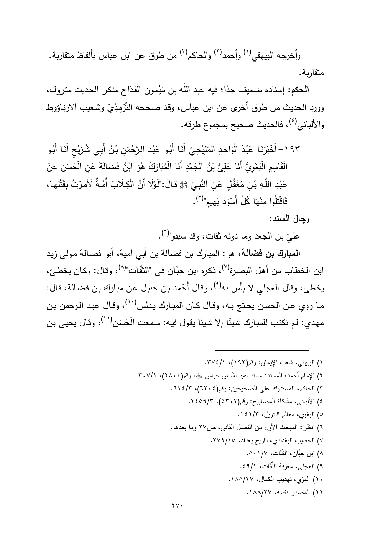 193 - أَخْبَرَنَا عَبْدُ الْوَاحِدِ المَلِيْحِيّ أَنَا أَبُو عَبْدِ الرَّحْمَنِ بْنُ أَبِي شُرَيْحٍ أَنَا أَبُو الْقَاسِمِ الْبَغَوِيُّ أَنَا عَلِيُّ بْنُ الْجَعْدِ أَنَا الْمُبَارَكُ هُوَ ابْنُ فَضَالَةَ عَنِ الْحَسَنِ عَنْ عَبْدِ اللَّهِ بْنِ مُغَفَّلٍ عَنِ النَّبِيِّ - صلى الله عليه وسلم - قَالَ: "لَوْلَا أَنَّ الْكِلَابَ أُمَّةٌ لَأَمَرْتُ بِقَتْلِهَا، فَاقْتُلُوا مِنْهَا كُلَّ أَسْوَدَ بَهِيمٍ" (¬5).