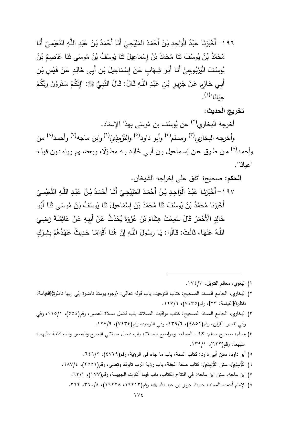 196 - أَخْبَرَنَا عَبْدُ الْوَاحِدِ بْنُ أَحْمَدَ المَلِيْحِيّ أَنَا أَحْمَدُ بْنُ عَبْدِ اللَّهِ النُّعَيْميّ أَنَا مُحَمَّدُ بْنُ يُوسُفَ ثَنَا مُحَمَّدُ بْنُ إِسْمَاعِيلَ ثَنَا يُوسُفُ بْنُ مُوسَى ثَنَا عَاصِمُ بْنُ يُوسُفَ الْيَرْبُوعِيُّ أَنَا أَبُو شِهَابٍ عَنْ إِسْمَاعِيلَ بْنِ أَبِي خَالِدٍ عَنْ قَيْسِ بْنِ أَبِي حَازِمٍ عَنْ جَرِيرِ بْنِ عَبْدِ اللَّهِ قَالَ: قَالَ النَّبِيُّ - صلى الله عليه وسلم -: "إِنَّكُمْ سَتَرَوْنَ رَبَّكُمْ عِيَانًا" (¬1).