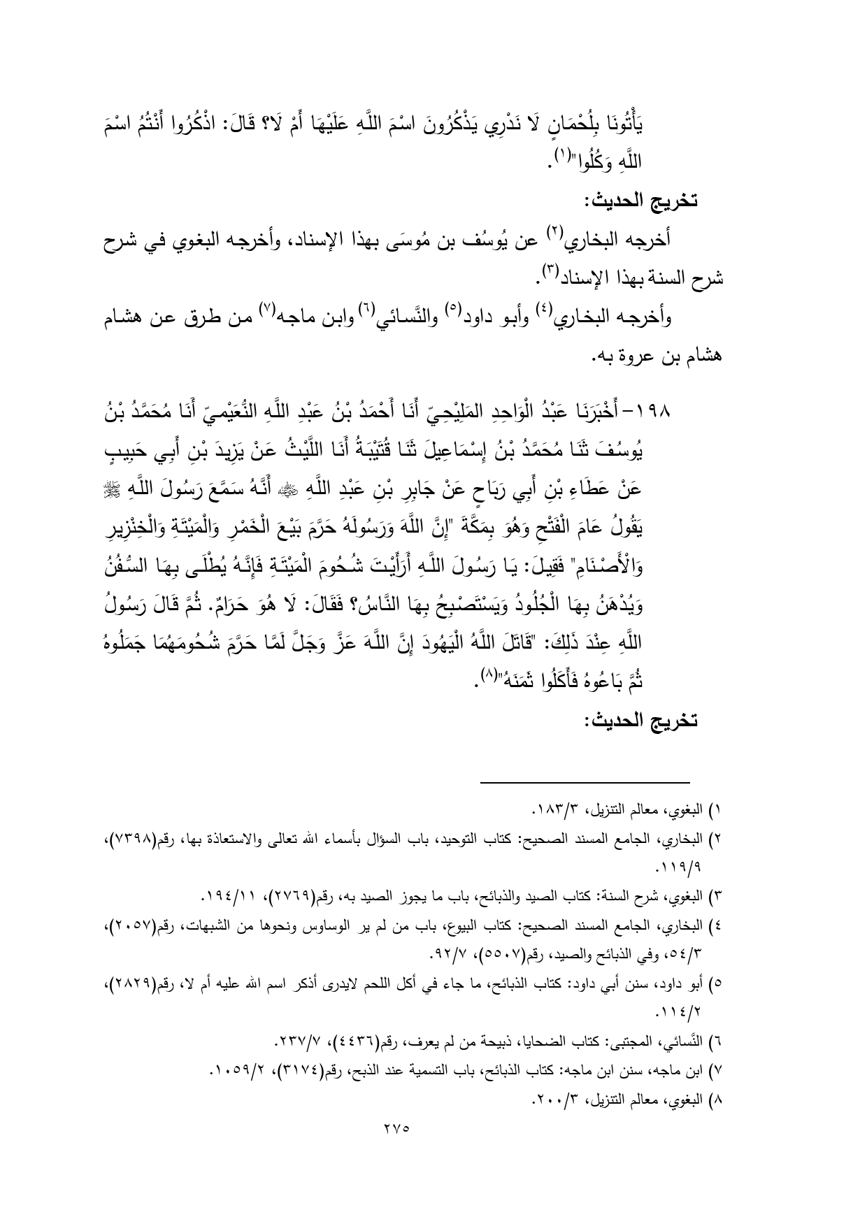 (¬3) البغوي، شرح السنة: كتاب الصيد والذبائح، باب ما يجوز الصيد به، رقم (2769)، 11/ 194.
