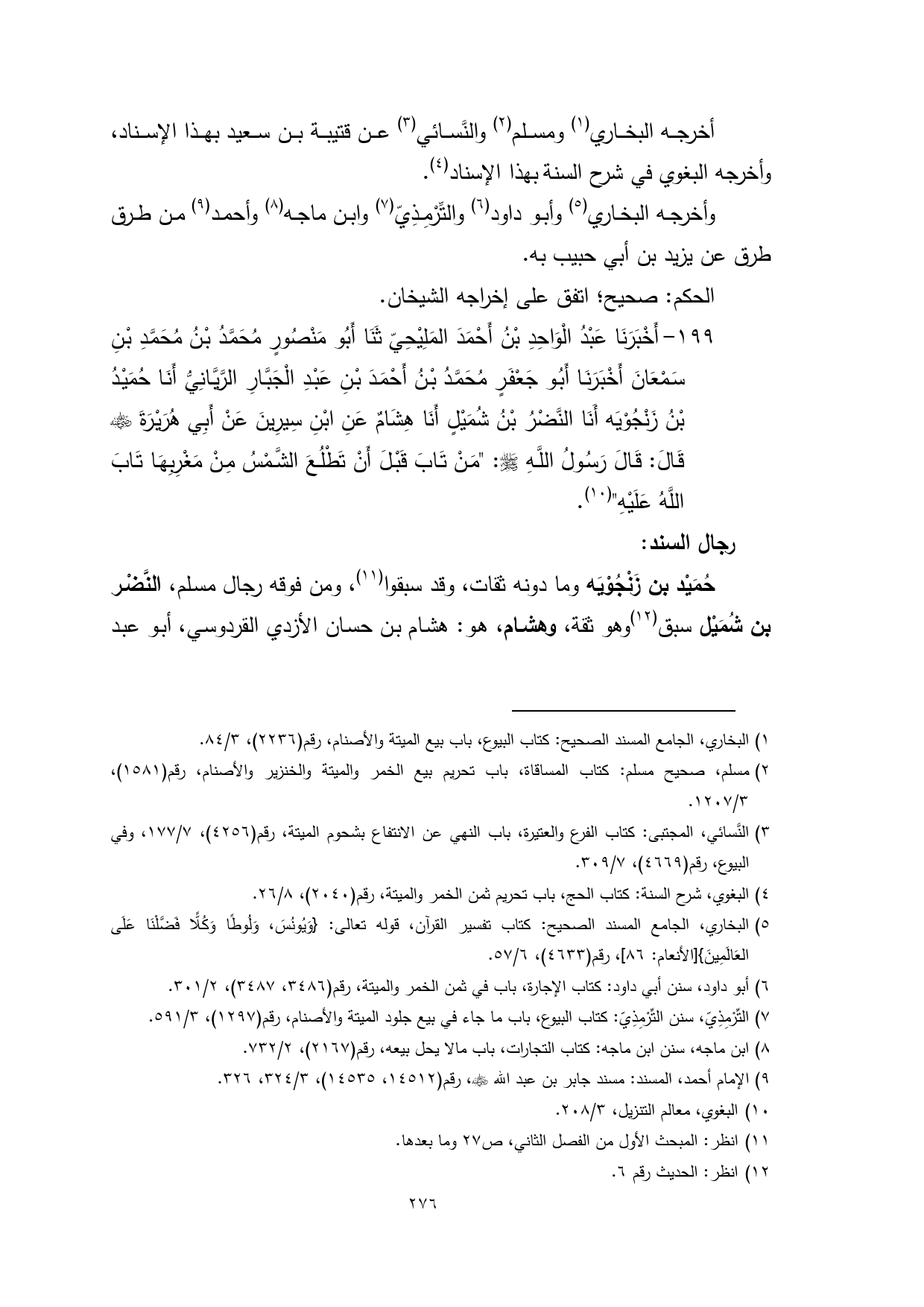 حُمَيْد بن زَنْجُوْيَه وما دونه ثقات، وقد سبقوا (¬11)، ومن فوقه رجال مسلم، النَّضْر بن شُمَيْل سبق (¬12) وهو ثقة، وهشام، هو: هشام بن حسان الأزدي القردوسي، أبو عبد