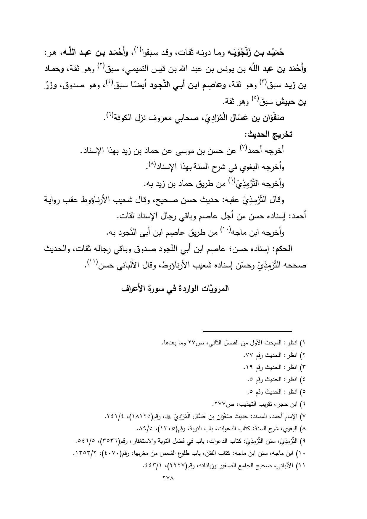 حُمَيْد بن زَنْجُوْيَه وما دونه ثقات، وقد سبقوا (¬1)، وأَحْمَد بن عبد اللَّه، هو: وأَحْمَد بن عبد اللَّه بن يونس بن عبد الله بن قيس التميمي، سبق (¬2) وهو ثقة، وحماد بن زيد سبق (¬3) وهو ثقة، وعاصِم ابن أبي النَّجود أيضًا سبق (¬4)، وهو صدوق، وزرِّ بن حبيش سبق (¬5) وهو ثقة.