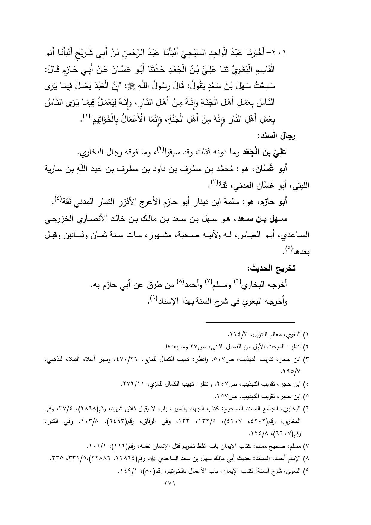201 - أَخْبَرَنَا عَبْدُ الْوَاحِدِ المَلِيْحِيّ أَنْبَأَنَا عَبْدُ الرَّحْمَنِ بْنُ أَبِي شُرَيْحٍ أَنْبَأَنَا أَبُو الْقَاسِمِ الْبَغَوِيُّ ثَنَا عَلِيُّ بْنُ الْجَعْدِ حَدَّثَنَا أَبُو غَسَّانَ عَنْ أَبِي حَازِمٍ قَالَ: سَمِعْتُ سَهْلَ بْنَ سَعْدٍ يَقُولُ: قَالَ رَسُولُ اللَّهِ - صلى الله عليه وسلم -: "إِنَّ الْعَبْدَ يَعْمَلُ فِيمَا يَرَى النَّاسُ بِعَمَلِ أَهْلِ الْجَنَّةِ وَإِنَّهُ مِنْ أَهْلِ النَّارِ، وَإِنَّهُ لِيَعْمَلُ فِيمَا يَرَى النَّاسُ بِعَمَلِ أَهْلِ النَّارِ وَإِنَّهُ مِنْ أَهْلِ الْجَنَّةِ، وَإِنَّمَا الْأَعْمَالُ بِالْخَوَاتِيمِ" (¬1).