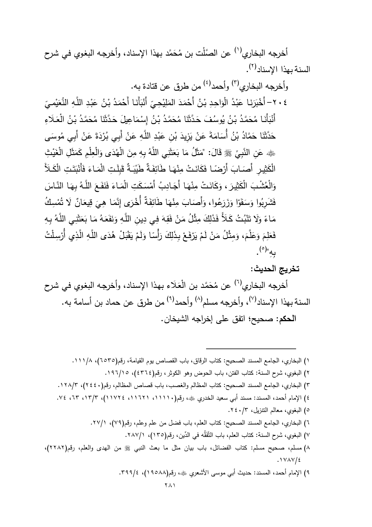 204 - أَخْبَرَنَا عَبْدُ الْوَاحِدِ بْنُ أَحْمَدَ المَلِيْحِيّ أَنْبَأَنَا أَحْمَدُ بْنُ عَبْدِ اللَّهِ النُّعَيْميّ أَنْبَأَنَا مُحَمَّدُ بْنُ يُوسُفَ حَدَّثَنَا مُحَمَّدُ بْنُ إِسْمَاعِيلَ حَدَّثَنَا مُحَمَّدُ بْنُ الْعَلَاءِ حَدَّثَنَا حَمَّادُ بْنُ أُسَامَةَ عَنْ يَزِيدَ بْنِ عَبْدِ اللَّهِ عَنْ أَبِي بُرْدَةَ عَنْ أَبِي مُوسَى - رضي الله عنه - عَنِ النَّبِيِّ - صلى الله عليه وسلم - قَالَ: "مَثَلُ مَا بَعَثَنِي اللَّهُ بِهِ مِنَ الْهُدَى وَالْعِلْمِ كَمَثَلِ الْغَيْثِ الْكَثِيرِ أَصَابَ أَرْضًا فَكَانَتْ مِنْهَا طَائِفَةٌ طَيِّبَةٌ قَبِلَتِ الْمَاءَ فَأَنْبَتَتِ الْكَلَأَ وَالْعُشْبَ الْكَثِيرَ، وَكَانَتْ مِنْهَا أَجَادِبُ أَمْسَكَتِ الْمَاءَ فَنَفَعَ اللَّهُ بِهَا النَّاسَ فَشَرِبُوا وَسَقَوْا وَزَرَعُوا، وَأَصَابَ مِنْهَا طَائِفَةٌ أُخْرَى إِنَّمَا هِيَ قِيعَانٌ لَا تُمْسِكُ مَاءً وَلَا تَنْبُتُ كَلَأً فَذَلِكَ مِثْلُ مَنْ فَقِهَ فِي دِينِ اللَّهِ وَنَفَعَهُ مَا بَعَثَنِي اللَّهُ بِهِ فَعَلِمَ وَعَلَّمَ، وَمِثْلُ مَنْ لَمْ يَرْفَعْ بِذَلِكَ رَأْسًا وَلَمْ يَقْبَلْ هُدَى اللَّهِ الَّذِي أُرْسِلْتُ بِهِ" (¬5).