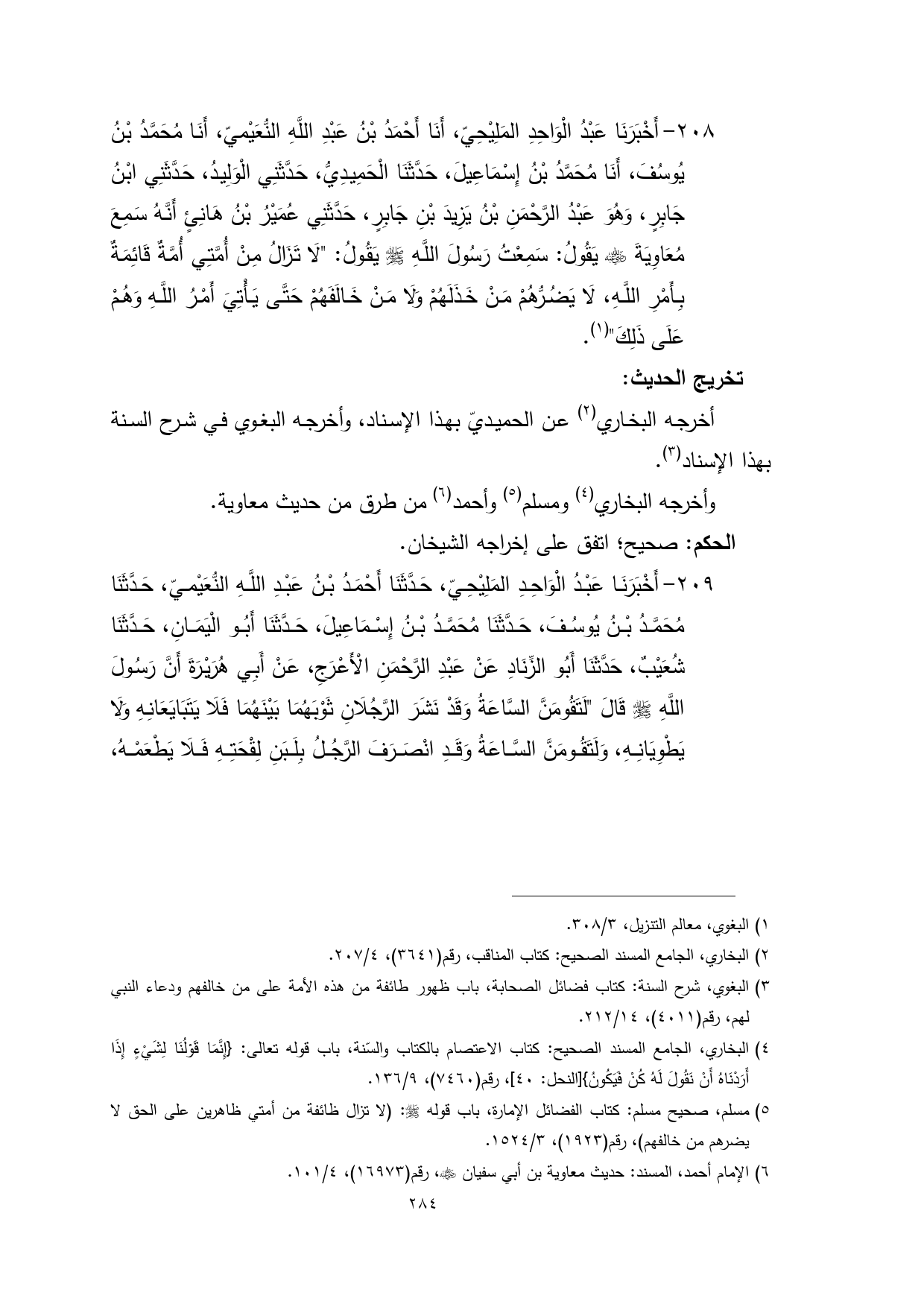 (¬3) البغوي، شرح السنة: كتاب فضائل الصحابة، باب ظهور طائفة من هذه الأمة على من خالفهم ودعاء النبي لهم، رقم (4011)، 14/ 212.