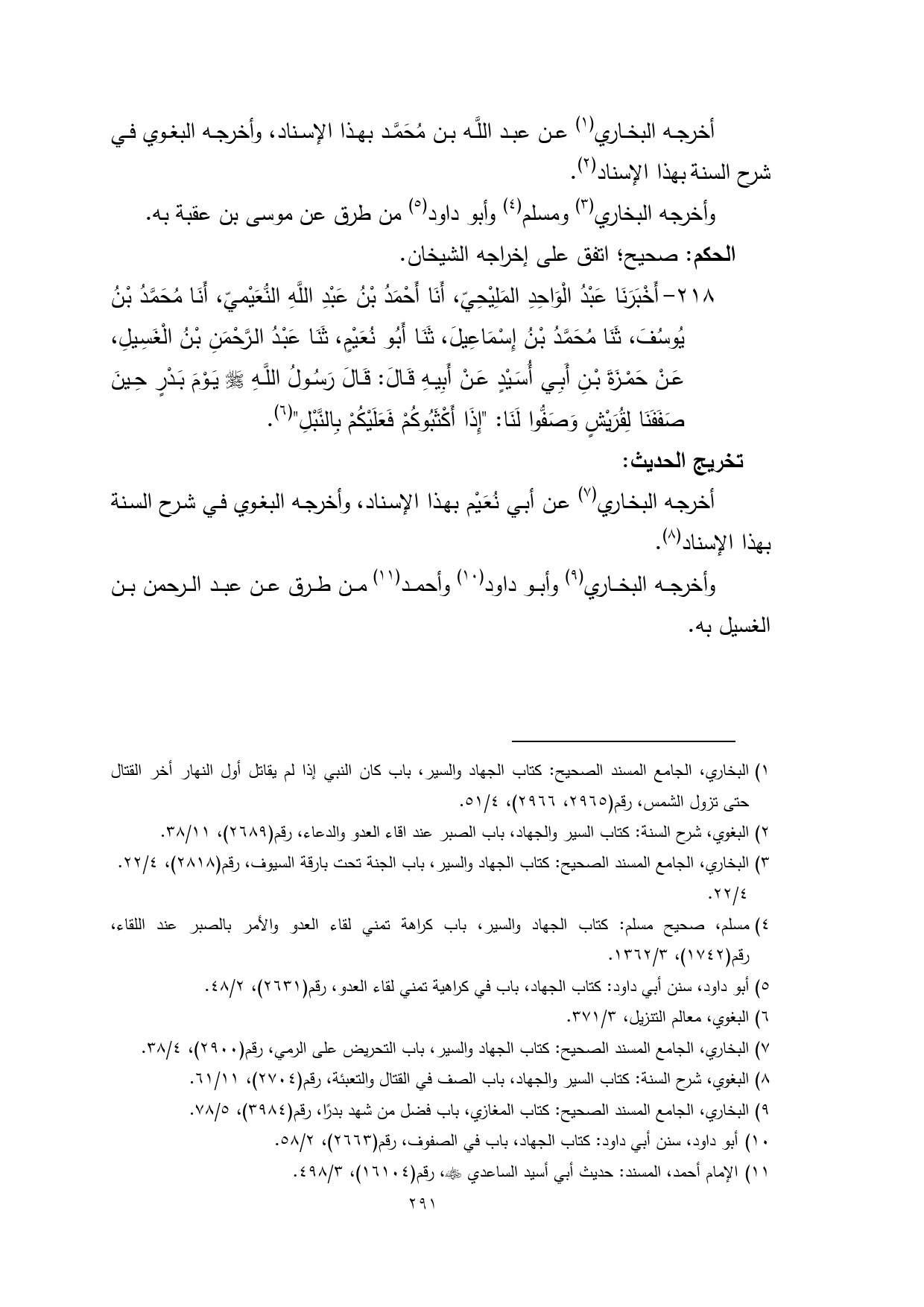 218 - أَخْبَرَنَا عَبْدُ الْوَاحِدِ المَلِيْحِيّ، أَنَا أَحْمَدُ بْنُ عَبْدِ اللَّهِ النُّعَيْميّ، أَنَا مُحَمَّدُ بْنُ يُوسُفَ، ثَنَا مُحَمَّدُ بْنُ إِسْمَاعِيلَ، ثَنَا أَبُو نُعَيْمٍ، ثَنَا عَبْدُ الرَّحْمَنِ بْنُ الْغَسِيلِ، عَنْ حَمْزَةَ بْنِ أَبِي أُسَيْدٍ عَنْ أَبِيهِ قَالَ: قَالَ رَسُولُ اللَّهِ - صلى الله عليه وسلم - يَوْمَ بَدْرٍ حِينَ صَفَفَنَا لِقُرَيْشٍ وَصَفُّوا لَنَا: "إِذَا أَكْثَبُوكُمْ فَعَلَيْكُمْ بِالنَّبْلِ" (¬6).