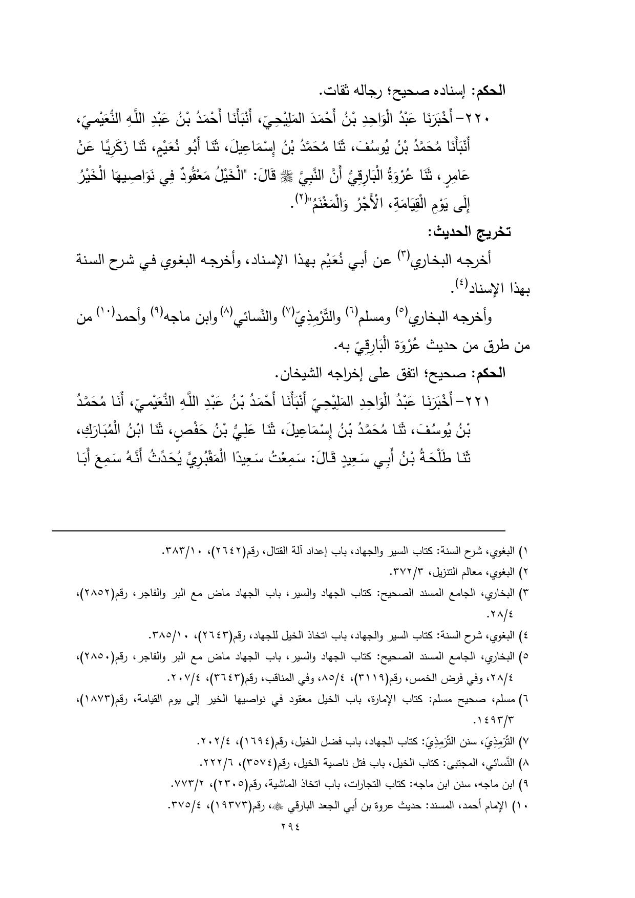 (¬3) البغوي، شرح السنة: كتاب السير والجهاد، باب اتخاذ الخيل للجهاد، رقم (2643)، 10/ 385.