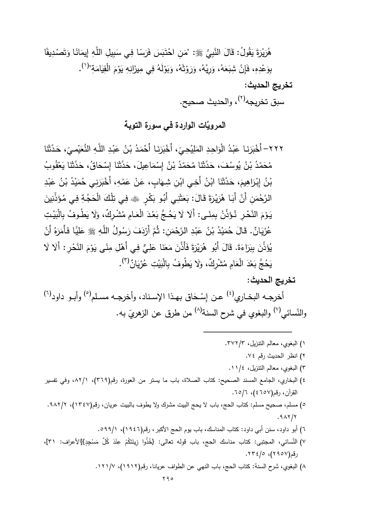 (¬8) البغوي، شرح السنة: كتاب الحج، باب النهي عن الطواف عريانا، رقم (1912)، 7/ 121.