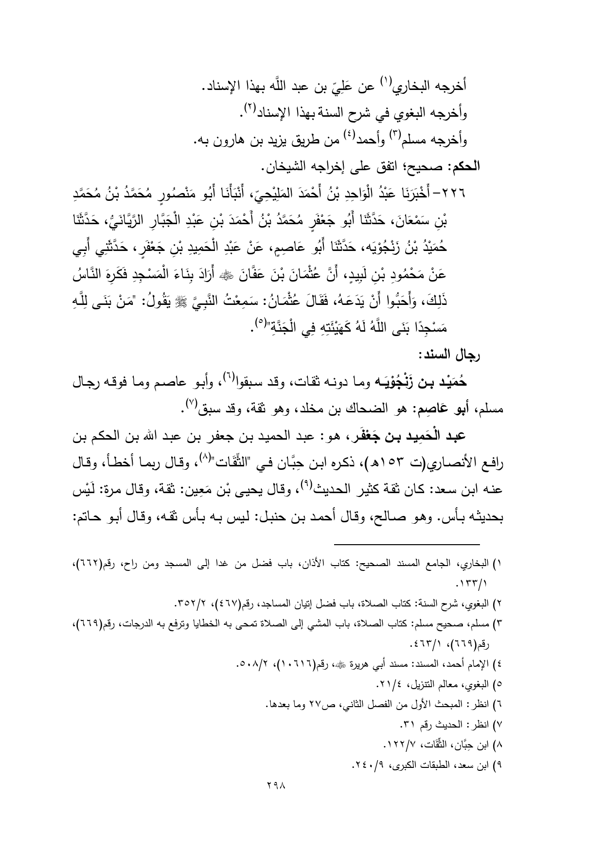 226 - أَخْبَرَنَا عَبْدُ الْوَاحِدِ بْنُ أَحْمَدَ المَلِيْحِيّ، أَنْبَأَنَا أَبُو مَنْصُورٍ مُحَمَّدُ بْنُ مُحَمَّدِ بْنِ سَمْعَانَ، حَدَّثَنَا أَبُو جَعْفَرٍ مُحَمَّدُ بْنُ أَحْمَدَ بْنِ عَبْدِ الْجَبَّارِ الرَّيَّانَيُّ، حَدَّثَنَا حُمَيْدُ بْنُ زَنْجُوْيَه، حَدَّثَنَا أَبُو عَاصِمٍ، عَنْ عَبْدِ الْحَمِيدِ بْنِ جَعْفَرٍ، حَدَّثَنِي أَبِي عَنْ مَحْمُودِ بْنِ لَبِيدٍ، أَنَّ عُثْمَانَ بْنَ عَفَّانَ - رضي الله عنه - أَرَادَ بِنَاءَ الْمَسْجِدِ فَكَرِهَ النَّاسُ ذَلِكَ، وَأَحَبُّوا أَنْ يَدَعَهُ، فَقَالَ عُثْمَانُ: سَمِعْتُ النَّبِيَّ - صلى الله عليه وسلم - يَقُولُ: "مَنْ بَنَى لِلَّهِ مَسْجِدًا بَنَى اللَّهُ لَهُ كَهَيْئَتِهِ فِي الْجَنَّةِ" (¬5).