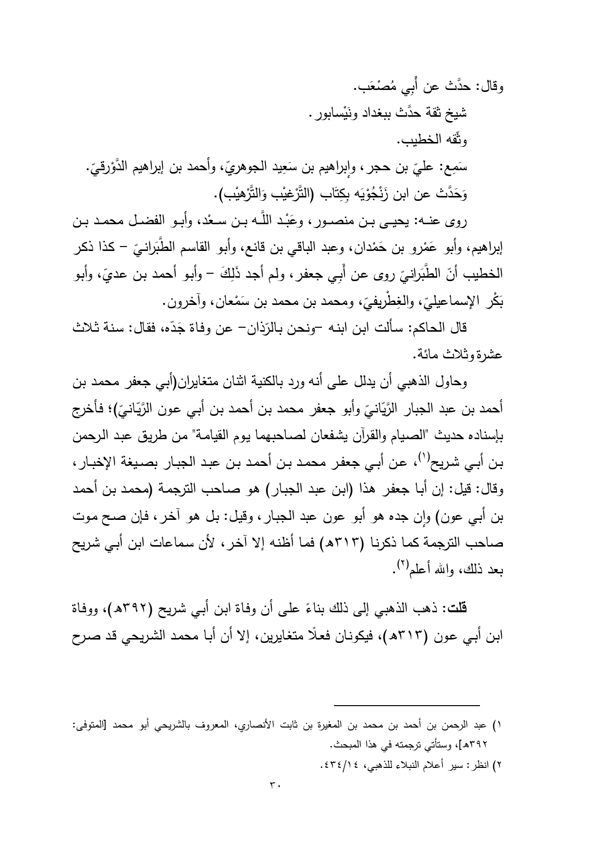 وحاول الذهبي أن يدلل على أنه ورد بالكنية اثنان متغايران (أبي جعفر محمد بن أحمد بن عبد الجبار الرَّيّانيّ وأبو جعفر محمد بن أحمد بن أبي عون الرَّيّانيّ)؛ فأخرج بإسناده حديث "الصيام والقرآن يشفعان لصاحبهما يوم القيامة" من طريق عبد الرحمن بن أبي شريح (¬1)، عن أبي جعفر محمد بن أحمد بن عبد الجبار بصيغة الإخبار، وقال: قيل: إن أبا جعفر هذا (ابن عبد الجبار) هو صاحب الترجمة (محمد بن أحمد بن أبي عون) وإن جده هو أبو عون عبد الجبار، وقيل: بل هو آخر، فإن صح موت صاحب الترجمة كما ذكرنا (313 هـ) فما أظنه إلا آخر، لأن سماعات ابن أبي شريح بعد ذلك، والله أعلم (¬2).