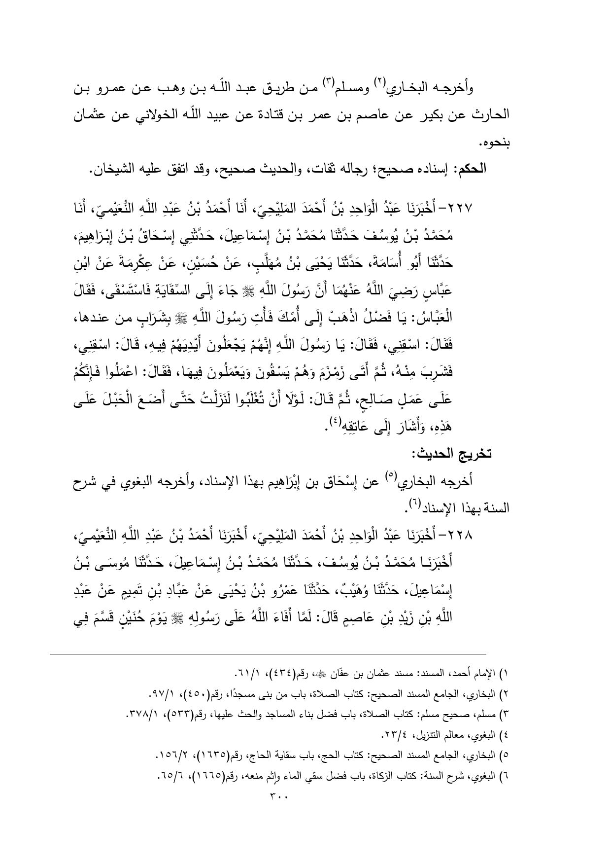 227 - أَخْبَرَنَا عَبْدُ الْوَاحِدِ بْنُ أَحْمَدَ المَلِيْحِيّ، أَنَا أَحْمَدُ بْنُ عَبْدِ اللَّهِ النُّعَيْميّ، أَنَا مُحَمَّدُ بْنُ يُوسُفَ حَدَّثَنَا مُحَمَّدُ بْنُ إِسْمَاعِيلَ، حَدَّثَنِي إِسْحَاقُ بْنُ إِبْرَاهِيمَ، حَدَّثَنَا أَبُو أُسَامَةَ، حَدَّثَنَا يَحْيَى بْنُ مُهَلَّبٍ، عَنْ حُسَيْنٍ، عَنْ عِكْرِمَةَ عَنْ ابْنِ عَبَّاسٍ رَضِيَ اللَّهُ عَنْهُمَا أَنَّ رَسُولَ اللَّهِ - صلى الله عليه وسلم - جَاءَ إِلَى السِّقَايَةِ فَاسْتَسْقَى، فَقَالَ الْعَبَّاسُ: يَا فَضْلُ اذْهَبْ إِلَى أُمِّكَ فَأْتِ رَسُولَ اللَّهِ - صلى الله عليه وسلم - بِشَرَابٍ من عندها، فَقَالَ: اسْقِنِي، فَقَالَ: يَا رَسُولَ اللَّهِ إِنَّهُمْ يَجْعَلُونَ أَيْدِيَهُمْ فِيهِ، قَالَ: اسْقِنِي، فَشَرِبَ مِنْهُ، ثُمَّ أَتَى زَمْزَمَ وَهُمْ يَسْقُونَ وَيَعْمَلُونَ فِيهَا، فَقَالَ: اعْمَلُوا فَإِنَّكُمْ عَلَى عَمَلٍ صَالِحٍ، ثُمَّ قَالَ: لَوْلَا أَنْ تُغْلَبُوا لَنَزَلْتُ حَتَّى أَضَعَ الْحَبْلَ عَلَى هَذِهِ، وَأَشَارَ إِلَى عَاتِقِهِ (¬3).