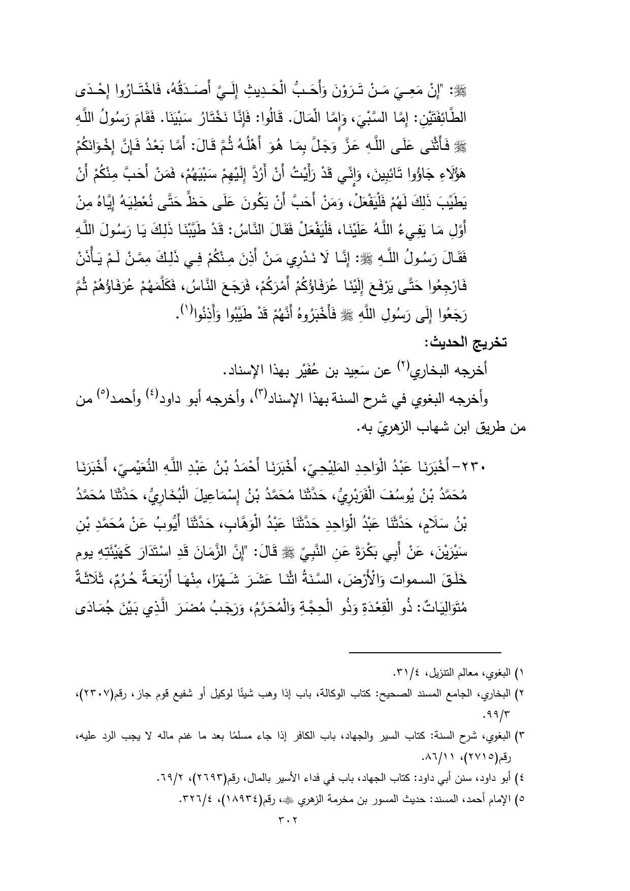 فَقَامَ رَسُولُ اللَّهِ - صلى الله عليه وسلم - فَأَثْنَى عَلَى اللَّهِ عَزَّ وَجَلَّ بِمَا هُوَ أَهْلُهُ ثُمَّ قَالَ: أَمَّا بَعْدُ فَإِنَّ إِخْوَانَكُمْ هَؤُلَاءِ جَاؤُوا تَائِبِينَ، وَإِنِّي قَدْ رَأَيْتُ أَنْ أَرُدَّ إِلَيْهِمْ سَبْيَهُمْ، فَمَنْ أَحَبَّ مِنْكُمْ أَنْ يَطَيِّبَ ذَلِكَ لَهُمْ فَلْيَفْعَلْ، وَمَنْ أَحَبَّ أَنْ يَكُونَ عَلَى حَظٍّ حَتَّى نُعْطِيَهُ إِيَّاهُ مِنْ أَوَّلِ مَا يَفِيءُ اللَّهُ عَلَيْنَا، فَلْيَفْعَلْ فَقَالَ النَّاسُ: قَدْ طَيَّبْنَا ذَلِكَ يَا رَسُولَ اللَّهِ فَقَالَ رَسُولُ اللَّهِ - صلى الله عليه وسلم -: إِنَّا لَا نَدْرِي مَنْ أَذِنَ مِنْكُمْ فِي ذَلِكَ مِمَّنْ لَمْ يَأْذَنْ فَارْجِعُوا حَتَّى يَرْفَعَ إِلَيْنَا عُرَفَاؤُكُمْ أَمْرَكُمْ، فَرَجَعَ النَّاسُ، فَكَلَّمَهُمْ عُرَفَاؤُهُمْ ثُمَّ رَجَعُوا إِلَى رَسُولِ اللَّهِ - صلى الله عليه وسلم - فَأَخْبَرُوهُ أَنَّهُمْ قَدْ طَيَّبُوا وَأَذِنُوا (¬1).