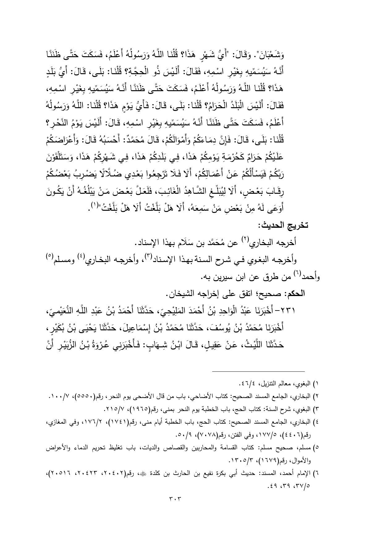 (¬3) البغوي، شرح السنة: كتاب الحج، باب الخطبة يوم النحر بمنى، رقم (1965)، 7/ 215.
