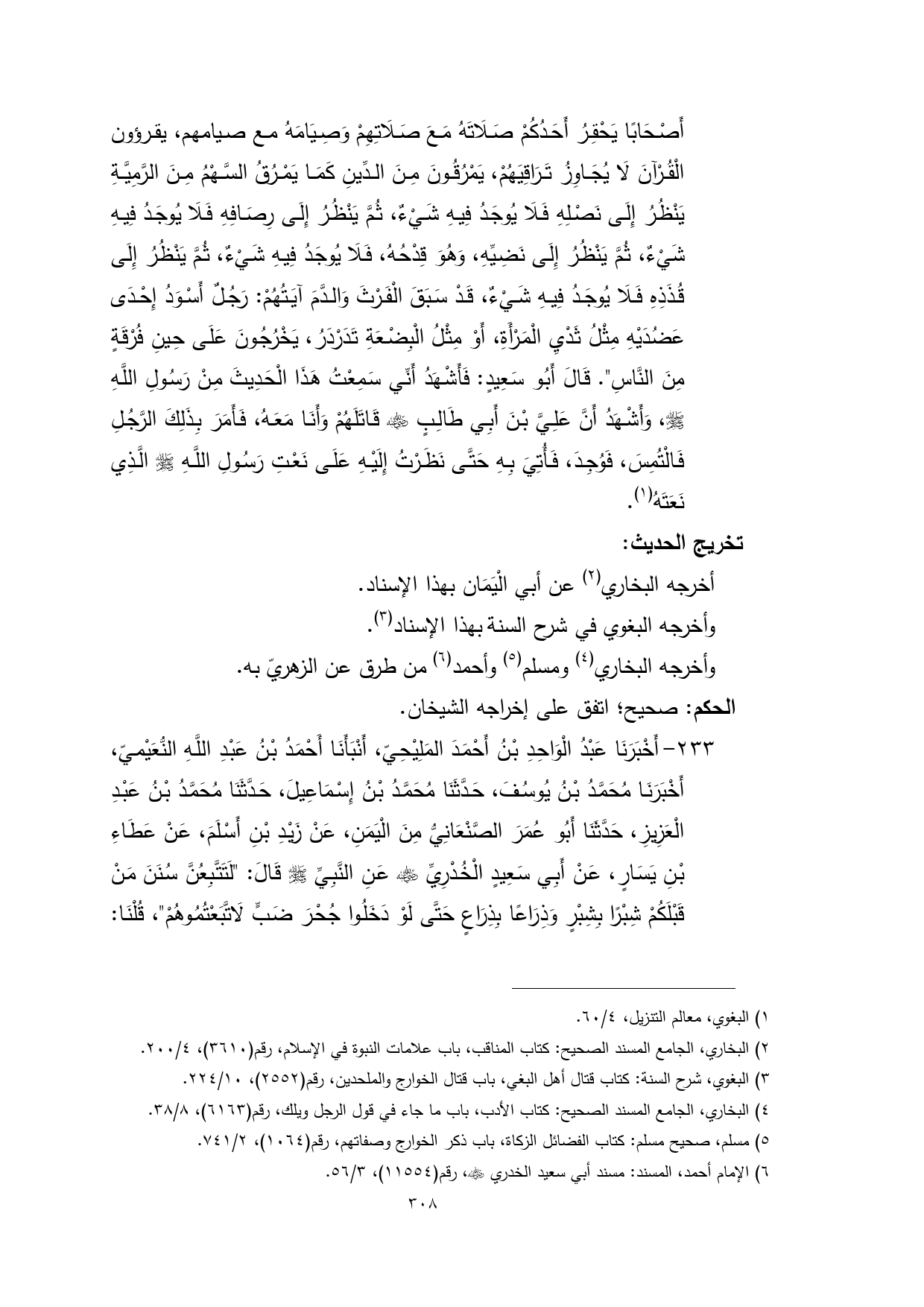 (¬3) البغوي، شرح السنة: كتاب قتال أهل البغي، باب قتال الخوارج والملحدين، رقم (2552)، 10/ 224.