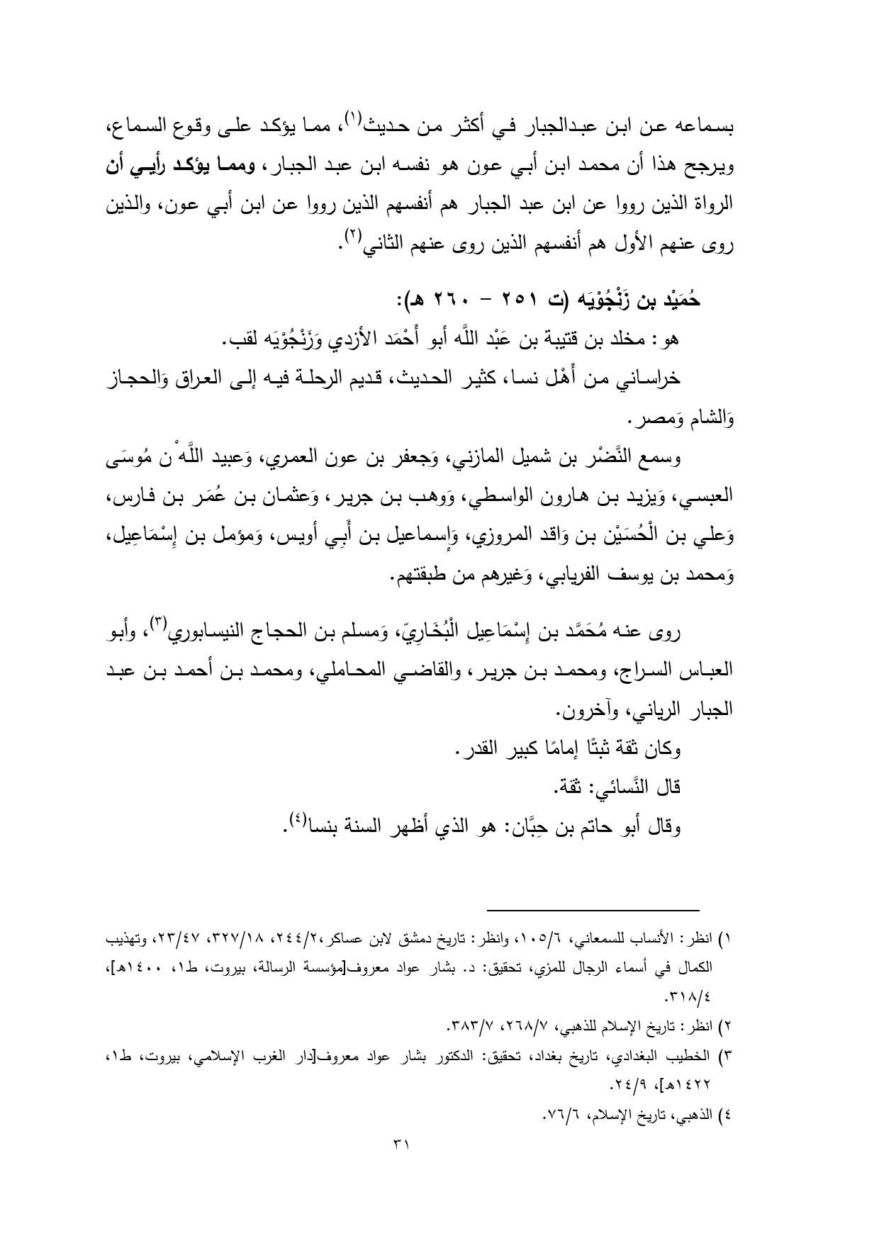 بسماعه عن ابن عبدالجبار في أكثر من حديث (¬1)، مما يؤكد على وقوع السماع، ويرجح هذا أن محمد ابن أبي عون هو نفسه ابن عبد الجبار، ومما يؤكد رأيي أن الرواة الذين رووا عن ابن عبد الجبار هم أنفسهم الذين رووا عن ابن أبي عون، والذين روى عنهم الأول هم أنفسهم الذين روى عنهم الثاني (¬2).