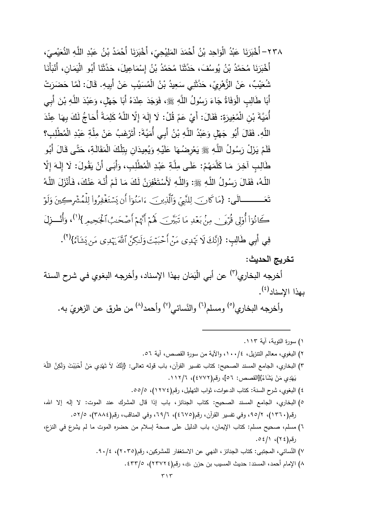 238 - أَخْبَرَنَا عَبْدُ الْوَاحِد بْنُ أَحْمَدَ المَلِيْحِيّ، أَخْبَرَنَا أَحْمَدُ بْنُ عَبْدِ اللَّهِ النُّعَيْميّ، أَخْبَرَنَا مُحَمَّدُ بْنُ يُوسُفَ، حَدَّثَنَا مُحَمَّدُ بْنُ إِسْمَاعِيلَ، حَدَّثَنَا أَبُو الْيَمَانِ، أَنْبَأَنَا شُعَيْبٌ، عَنْ الزُّهْرِيِّ، حَدَّثَنِي سَعِيدُ بْنُ الْمُسَيَّبِ عَنْ أَبِيهِ. قَالَ: لَمَّا حَضَرَتْ أَبَا طَالِبٍ الْوَفَاةُ جَاءَ رَسُولُ اللَّهِ - صلى الله عليه وسلم -، فَوَجَدَ عِنْدَهُ أَبَا جَهْلٍ، وَعَبْدَ اللَّهِ بْنَ أَبِي أُمَيَّةَ بْنِ الْمُغِيرَةِ: فَقَالَ: أَيْ عَمِّ قُلْ: لَا إِلَهَ إِلَّا اللَّهُ كَلِمَةً أُحَاجُّ لَكَ بِهَا عِنْدَ اللَّهِ. فَقَالَ أَبُو جَهْلٍ وَعَبْدُ اللَّهِ بْنُ أَبِي أُمَيَّةَ: أَتَرْغَبُ عَنْ مِلَّةِ عَبْدِ الْمُطَّلِبِ؟ فَلَمْ يَزَلْ رَسُولُ اللَّهِ - صلى الله عليه وسلم - يَعْرِضُهَا عَلَيْهِ وَيُعِيدَانِ بِتِلْكَ الْمَقَالَةِ، حَتَّى قَالَ أَبُو طَالِبٍ آخِرَ مَا كَلَّمَهُمْ: عَلَى مِلَّةِ عَبْدِ الْمُطَّلِبِ، وَأَبَى أَنْ يَقُولَ: لَا إِلَهَ إِلَّا اللَّهُ، فَقَالَ رَسُولُ اللَّهِ - صلى الله عليه وسلم -: وَاللَّهِ لَأَسْتَغْفِرَنَّ لَكَ مَا لَمْ أُنْهَ عَنْكَ، فَأَنْزَلَ اللَّهُ تَعَالَى: {مَا كَانَ لِلنَّبِيِّ وَالَّذِينَ آَمَنُوا أَنْ يَسْتَغْفِرُوا لِلْمُشْرِكِينَ وَلَوْ كَانُوا أُولِي قُرْبَى مِنْ بَعْدِ مَا تَبَيَّنَ لَهُمْ أَنَّهُمْ أَصْحَابُ الْجَحِيمِ} (¬1)، وَأُنْزِلَ فِي أَبِي طَالِبٍ: {إِنَّكَ لَا تَهْدِي مَنْ أَحْبَبْتَ وَلَكِنَّ اللَّهَ يَهْدِي مَنْ يَشَاءُ} (¬2).