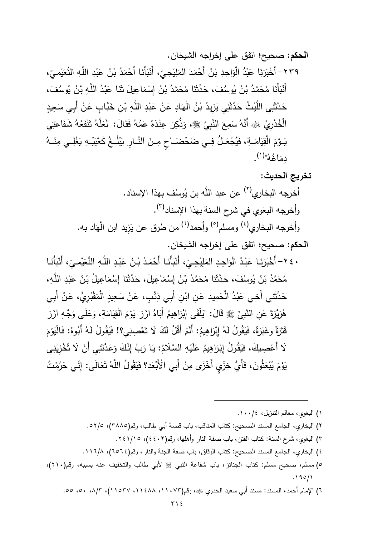 239 - أَخْبَرَنَا عَبْدُ الْوَاحِدِ بْنُ أَحْمَدَ المَلِيْحِيّ، أَنْبَأَنَا أَحْمَدُ بْنُ عَبْدِ اللَّهِ النُّعَيْميّ، أَنْبَأَنَا مُحَمَّدُ بْنُ يُوسُفَ، حَدَّثَنَا مُحَمَّدُ بْنُ إِسْمَاعِيلَ ثَنَا عَبْدُ اللَّهِ بْنُ يُوسُفَ، حَدَّثَنِي اللَّيْثُ حَدَّثَنِي يَزِيدُ بْنُ الْهَادِ عَنْ عَبْدِ اللَّهِ بْنِ خَبَّابٍ عَنْ أَبِي سَعِيدٍ الْخُدْرِيِّ - رضي الله عنه - أَنَّهُ سَمِعَ النَّبِيَّ - صلى الله عليه وسلم -، وَذُكِرَ عِنْدَهُ عَمُّهُ فَقَالَ: "لَعَلَّهُ تَنْفَعُهُ شَفَاعَتِي يَوْمَ الْقِيَامَةِ، فَيُجْعَلُ فِي ضَحْضَاحٍ مِنَ النَّارِ يَبْلُغُ كَعْبَيْهِ يَغْلِي مِنْهُ دِمَاغُهُ" (¬1).