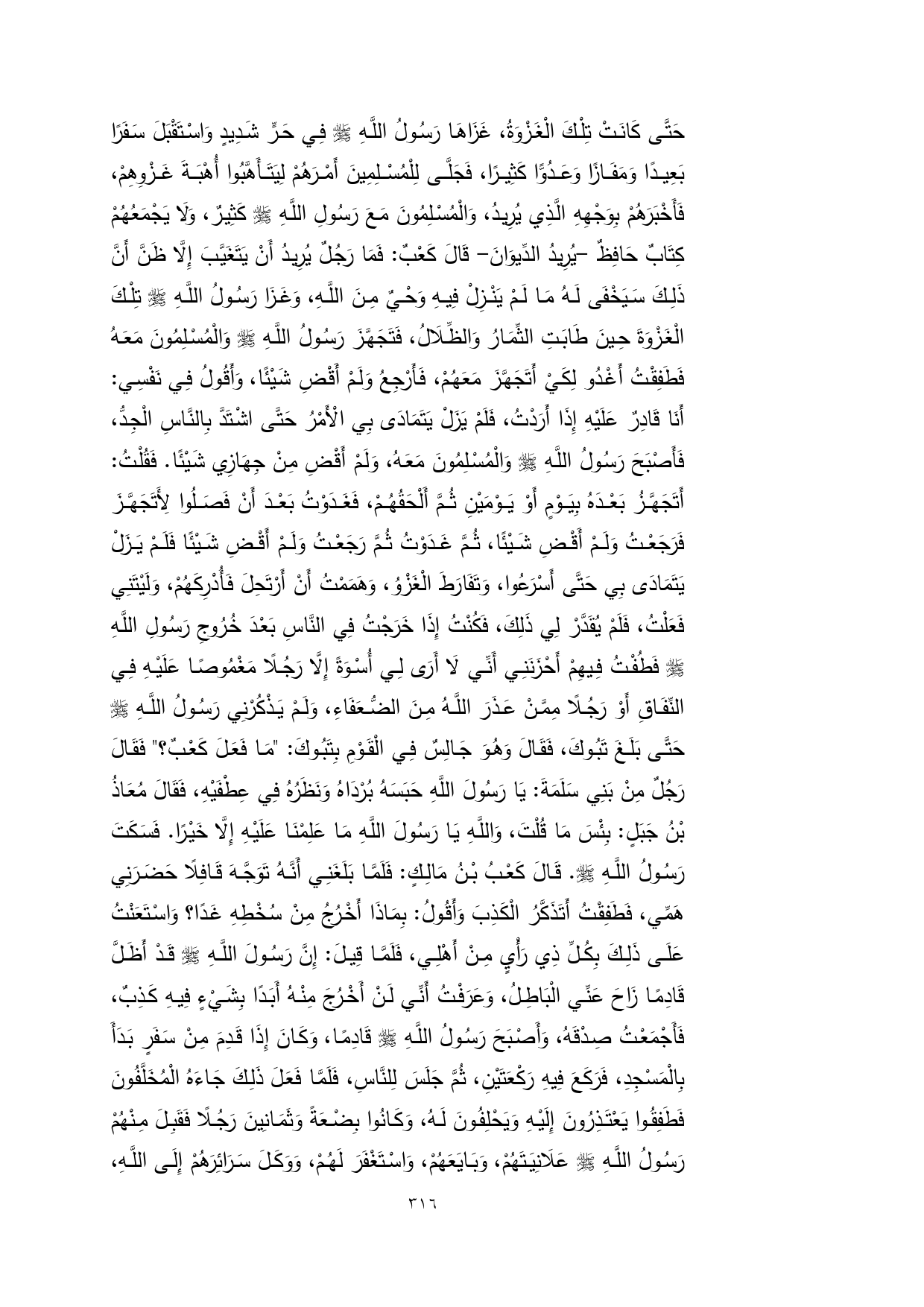 حَتَّى كَانَتْ تِلْكَ الْغَزْوَةُ، غَزَاهَا رَسُولُ اللَّهِ - صلى الله عليه وسلم - فِي حَرٍّ شَدِيدٍ وَاسْتَقْبَلَ سَفَرًا بَعِيدًا وَمَفَازًا وَعَدُوًّا كَثِيرًا، فَجَلَّى لِلْمُسْلِمِينَ أَمْرَهُمْ لِيَتَأَهَّبُوا أُهْبَةَ غَزْوِهِمْ، فَأَخْبَرَهُمْ بِوَجْهِهِ الَّذِي يُرِيدُ، وَالْمُسْلِمُونَ مَعَ رَسُولِ اللَّهِ - صلى الله عليه وسلم - كَثِيرٌ، وَلَا يَجْمَعُهُمْ كِتَابٌ حَافِظٌ -يُرِيدُ الدِّيوَانَ- قَالَ كَعْبٌ: فَمَا رَجُلٌ يُرِيدُ أَنْ يَتَغَيَّبَ إِلَّا ظَنَّ أَنَّ ذَلِكَ سَيَخْفَى لَهُ مَا لَمْ يَنْزِلْ فِيهِ وَحْيٌ مِنَ اللَّهِ، وَغَزَا رَسُولُ اللَّهِ - صلى الله عليه وسلم - تِلْكَ الْغَزْوَةَ حِينَ طَابَتِ الثِّمَارُ وَالظِّلَالُ، فَتَجَهَّزَ رَسُولُ اللَّهِ - صلى الله عليه وسلم - وَالْمُسْلِمُونَ مَعَهُ فَطَفِقْتُ أَغْدُو لِكَيْ أَتَجَهَّزَ مَعَهُمْ، فَأَرْجِعُ وَلَمْ أَقْضِ شَيْئًا، وَأَقُولُ فِي نَفْسِي: أَنَا قَادِرٌ عَلَيْهِ إِذَا أَرَدْتُ، فَلَمْ يَزَلْ يَتَمَادَى بِي الْأَمْرُ حَتَّى اشْتَدَّ بِالنَّاسِ الْجِدُّ، فَأَصْبَحَ رَسُولُ اللَّهِ - صلى الله عليه وسلم - وَالْمُسْلِمُونَ مَعَهُ، وَلَمْ أَقْضِ مِنْ جِهَازِي شَيْئًا. فَقُلْتُ: أَتَجَهَّزُ بَعْدَهُ بِيَوْمٍ أَوْ يَوْمَيْنِ ثُمَّ أَلْحَقُهُمْ، فَغَدَوْتُ بَعْدَ أَنْ فَصَلُوا لِأَتَجَهَّزَ فَرَجَعْتُ وَلَمْ أَقْضِ شَيْئًا، ثُمَّ غَدَوْتُ ثُمَّ رَجَعْتُ وَلَمْ أَقْضِ شَيْئًا فَلَمْ يَزَلْ يَتَمَادَى بِي حَتَّى أَسْرَعُوا، وَتَفَارَطَ الْغَزْوُ، وَهَمَمْتُ أَنْ أَرْتَحِلَ فَأُدْرِكَهُمْ، وَلَيْتَنِي فَعَلْتُ، فَلَمْ يُقَدَّرْ لِي ذَلِكَ، فَكُنْتُ إِذَا خَرَجْتُ فِي النَّاسِ بَعْدَ خُرُوجِ رَسُولِ اللَّهِ - صلى الله عليه وسلم - فَطُفْتُ فِيهِمْ أَحْزَنَنِي أَنِّي لَا أَرَى لِي أُسْوَةً إِلَّا رَجُلًا مَغْمُوصًا عَلَيْهِ فِي النِّفَاقِ أَوْ رَجُلًا مِمَّنْ عَذَرَ اللَّهُ مِنَ الضُّعَفَاءِ، وَلَمْ يَذْكُرْنِي رَسُولُ اللَّهِ - صلى الله عليه وسلم - حَتَّى بَلَغَ تَبُوكَ، فَقَالَ وَهُوَ جَالِسٌ فِي الْقَوْمِ بِتَبُوكَ: "مَا فَعَلَ كَعْبٌ؟ " فَقَالَ رَجُلٌ مِنْ بَنِي سَلَمَةَ: يَا رَسُولَ اللَّهِ حَبَسَهُ بُرْدَاهُ وَنَظَرُهُ فِي عِطْفَيْهِ، فَقَالَ مُعَاذُ بْنُ جَبَلٍ: بِئْسَ مَا قُلْتَ، وَاللَّهِ يَا رَسُولَ اللَّهِ مَا عَلِمْنَا عَلَيْهِ إِلَّا خَيْرًا. فَسَكَتَ رَسُولُ اللَّهِ - صلى الله عليه وسلم -. قَالَ كَعْبُ بْنُ مَالِكٍ: فَلَمَّا بَلَغَنِي أَنَّهُ تَوَجَّهَ قَافِلًا حَضَرَنِي هَمِّي، فَطَفِقْتُ أَتَذَكَّرُ الْكَذِبَ وَأَقُولُ: بِمَاذَا أَخْرُجُ مِنْ سُخْطِهِ غَدًا؟ وَاسْتَعَنْتُ عَلَى ذَلِكَ بِكُلِّ ذِي رَأْيٍ مِنْ أَهْلِي، فَلَمَّا قِيلَ: إِنَّ رَسُولَ اللَّهِ - صلى الله عليه وسلم - قَدْ أَظَلَّ قَادِمًا زَاحَ عَنِّي الْبَاطِلُ، وَعَرَفْتُ أَنِّي لَنْ أَخْرُجَ مِنْهُ أَبَدًا بِشَيْءٍ فِيهِ كَذِبٌ، فَأَجْمَعْتُ صِدْقَهُ، وَأَصْبَحَ رَسُولُ اللَّهِ - صلى الله عليه وسلم - قَادِمًا، وَكَانَ إِذَا قَدِمَ مِنْ سَفَرٍ بَدَأَ بِالْمَسْجِدِ، فَرَكَعَ فِيهِ رَكْعَتَيْنِ، ثُمَّ جَلَسَ لِلنَّاسِ، فَلَمَّا فَعَلَ ذَلِكَ جَاءَهُ الْمُخَلَّفُونَ فَطَفِقُوا يَعْتَذِرُونَ إِلَيْهِ وَيَحْلِفُونَ لَهُ، وَكَانُوا بِضْعَةً وَثَمَانِينَ رَجُلًا فَقَبِلَ مِنْهُمْ رَسُولُ اللَّهِ - صلى الله عليه وسلم - عَلَانِيَتَهُمْ، وَبَايَعَهُمْ، وَاسْتَغْفَرَ لَهُمْ، وَوَكَلَ سَرَائِرَهُمْ إِلَى اللَّهِ،