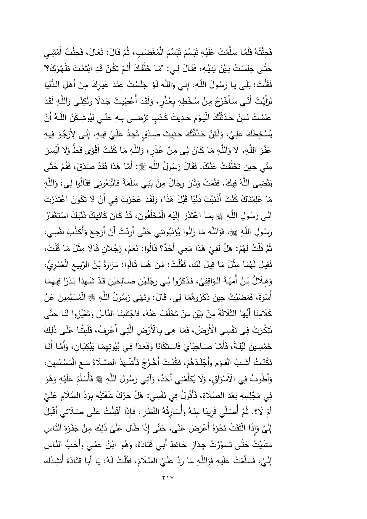 أَقْوَى قَطُّ وَلَا أَيْسَرَ مِنِّي حِينَ تَخَلَّفْتُ عَنْكَ. فَقَالَ رَسُولُ اللَّهِ - صلى الله عليه وسلم -: أَمَّا هَذَا فَقَدْ صَدَقَ، فَقُمْ حَتَّى يَقْضِيَ اللَّهُ فِيكَ. فَقُمْتُ وَثَارَ رِجَالٌ مِنْ بَنِي سَلَمَةَ فَاتَّبَعُونِي فَقَالُوا لِي: وَاللَّهِ مَا عَلِمْنَاكَ كُنْتَ أَذْنَبْتَ ذَنْبًا قَبْلَ هَذَا، وَلَقَدْ عَجَزْتَ فِي أَنْ لَا تَكَونَ اعْتَذَرْتَ إِلَى رَسُولِ اللَّهِ - صلى الله عليه وسلم - بِمَا اعْتَذَرَ إِلَيْهِ الْمُخَلَّفُونَ، قَدْ كَانَ كَافِيَكَ ذَنْبَكَ اسْتِغْفَارُ رَسُولِ اللَّهِ - صلى الله عليه وسلم -، فَوَاللَّهِ مَا زَالُوا يُؤَنِّبُونَنِي حَتَّى أَرَدْتُ أَنْ أَرْجِعَ وَأُكَذِّبَ نَفْسِي، ثُمَّ قُلْتُ لَهُمْ: هَلْ لَقِيَ هَذَا مَعِي أَحَدٌ؟ قَالُوا: نَعَمْ، رَجُلَانِ قَالَا مِثْلَ مَا قُلْتَ، فَقِيلَ لَهُمَا مِثْلَ مَا قِيلَ لَكَ، فَقُلْتُ: مَنْ هُمَا قَالُوا: مَرَارَةُ بْنُ الرَّبِيعِ الْعُمْرِيُّ، وَهِلَالُ بْنُ أُمَيَّةَ الوَاقِفِيُّ، فَذَكَرُوا لِي رَجُلَيْنِ صَالِحَيْنِ قَدْ شَهِدَا بَدْرًا فِيهِمَا أُسْوَةٌ، فَمَضَيْتُ حِينَ ذَكَرُوهُمَا لِي. قَالَ: وَنَهَى رَسُولُ اللَّهِ - صلى الله عليه وسلم - الْمُسْلِمِينَ عَنْ كَلَامِنَا أَيُّهَا الثَّلَاثَةُ مِنْ بَيْنِ مَنْ تَخَلَّفَ عَنْهُ، فَاجْتَنَبَنَا النَّاسُ وَتَغَيَّرُوا لَنَا حَتَّى تَنَكَّرَتْ فِي نَفْسِي الْأَرْضُ، فَمَا هِيَ بِالْأَرْضِ الَّتِي أَعْرِفُ، فَلَبِثْنَا عَلَى ذَلِكَ خَمْسِينَ لَيْلَةً، فَأَمَّا صَاحِبَايَ فَاسْتَكَانَا وَقَعَدَا فِي بُيُوتِهِمَا يَبْكِيَانِ، وَأَمَّا أَنَا فَكُنْتُ أَشَبَّ الْقَوْمِ وأَجْلَدَهُمْ، فَكُنْتُ أَخْرُجُ فَأَشْهَدُ الصَّلَاةَ مَعَ الْمُسْلِمِينَ، وَأَطُوفُ فِي الْأَسْوَاقِ، وَلَا يُكَلِّمُنِي أَحَدٌ، وَآتِي رَسُولَ اللَّهِ - صلى الله عليه وسلم - فَأُسَلِّمُ عَلَيْهِ وَهُوَ فِي مَجْلِسِهِ بَعْدَ الصَّلَاةِ، فَأَقُولُ فِي نَفْسِي: هَلْ حَرَّكَ شَفَتَيْهِ بِرَدِّ السَّلَامِ عَلَيَّ أَمْ لَا؟ . ثُمَّ أُصَلِّي قَرِيبًا مِنْهُ وَأُسَارِقُهُ النَّظَرَ، فَإِذَا أَقْبَلْتُ عَلَى صَلَاتِي أَقْبَلَ إِلَيَّ وَإِذَا الْتَفَتُّ نَحْوَهُ أَعْرَضَ عَنِّي، حَتَّى إِذَا طَالَ عَلَيَّ ذَلِكَ مِنْ جَفْوَةِ النَّاسِ مَشَيْتُ حَتَّى تَسَوَّرْتُ جِدَارَ حَائِطِ أَبِي قَتَادَةَ، وَهُوَ ابْنُ عَمِّي وَأَحَبُّ النَّاسِ إِلَيَّ، فَسَلَّمْتُ عَلَيْهِ فَوَاللَّهِ مَا رَدَّ عَلَيَّ السَّلَامَ، فَقُلْتُ لَهُ: يَا أَبَا قَتَادَةَ أُنْشِدُكَ