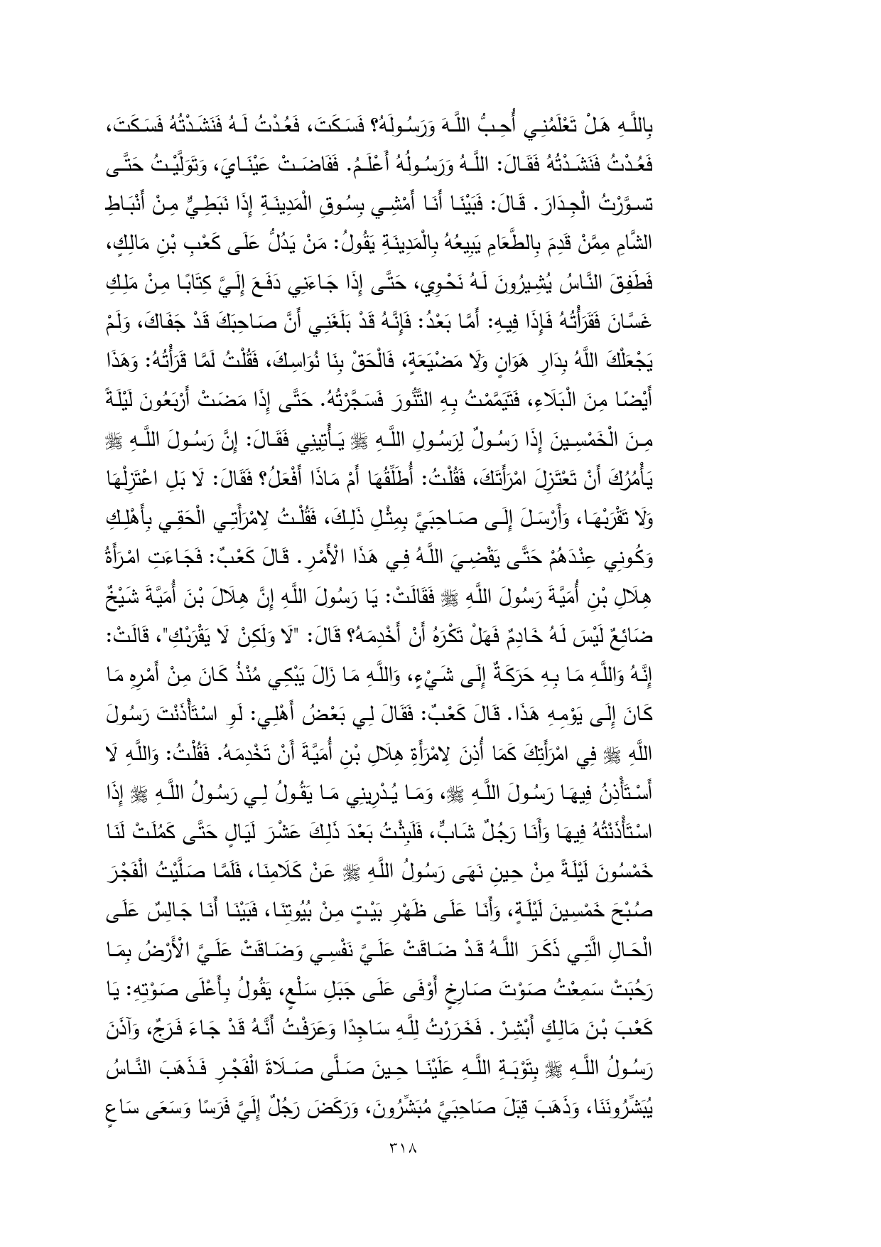 قَالَ: فَبَيْنَا أَنَا أَمْشِي بِسُوقِ الْمَدِينَةِ إِذَا نَبَطِيٌّ مِنْ أَنْبَاطِ الشَّامِ مِمَّنْ قَدِمَ بِالطَّعَامِ يَبِيعُهُ بِالْمَدِينَةِ يَقُولُ: مَنْ يَدُلُّ عَلَى كَعْبِ بْنِ مَالِكٍ، فَطَفِقَ النَّاسُ يُشِيرُونَ لَهُ نَحْوِي، حَتَّى إِذَا جَاءَنِي دَفَعَ إِلَيَّ كِتَابًا مِنْ مَلِكِ غَسَّانَ فَقَرَأْتُهُ فَإِذَا فِيهِ: أَمَّا بَعْدُ: فَإِنَّهُ قَدْ بَلَغَنِي أَنَّ صَاحِبَكَ قَدْ جَفَاكَ، وَلَمْ يَجْعَلْكَ اللَّهُ بِدَارِ هَوَانٍ وَلَا مَضْيَعَةٍ، فَالْحَقْ بِنَا نُوَاسِكَ، فَقُلْتُ لَمَّا قَرَأْتُهُ: وَهَذَا أَيْضًا مِنَ الْبَلَاءِ، فَتَيَمَّمْتُ بِهِ التَّنُّورَ فَسَجَّرْتُهُ. حَتَّى إِذَا مَضَتْ أَرْبَعُونَ لَيْلَةً مِنَ الْخَمْسِينَ إِذَا رَسُولٌ لِرَسُولِ اللَّهِ - صلى الله عليه وسلم - يَأْتِينِي فَقَالَ: إِنَّ رَسُولَ اللَّهِ - صلى الله عليه وسلم - يَأْمُرُكَ أَنْ تَعْتَزِلَ امْرَأَتَكَ، فَقُلْتُ: أُطَلِّقُهَا أَمْ مَاذَا أَفْعَلُ؟ فَقَالَ: لَا بَلِ اعْتَزِلْهَا وَلَا تَقْرَبْهَا، وَأَرْسَلَ إِلَى صَاحِبَيَّ بِمِثْلِ ذَلِكَ، فَقُلْتُ لِامْرَأَتِي الْحَقِي بِأَهْلِكِ وَكُونِي عِنْدَهُمْ حَتَّى يَقْضِيَ اللَّهُ فِي هَذَا الْأَمْرِ. قَالَ كَعْبٌ: فَجَاءَتِ امْرَأَةُ هِلَالِ بْنِ أُمَيَّةَ رَسُولَ اللَّهِ - صلى الله عليه وسلم - فَقَالَتْ: يَا رَسُولَ اللَّهِ إِنَّ هِلَالَ بْنَ أُمَيَّةَ شَيْخٌ ضَائِعٌ لَيْسَ لَهُ خَادِمٌ فَهَلْ تَكْرَهُ أَنْ أَخْدِمَهُ؟ قَالَ: "لَا وَلَكِنْ لَا يَقْرَبْكِ"، قَالَتْ: إِنَّهُ وَاللَّهِ مَا بِهِ حَرَكَةٌ إِلَى شَيْءٍ، وَاللَّهِ مَا زَالَ يَبْكِي مُنْذُ كَانَ مِنْ أَمْرِهِ مَا كَانَ إِلَى يَوْمِهِ هَذَا. قَالَ كَعْبٌ: فَقَالَ لِي بَعْضُ أَهْلِي: لَوِ اسْتَأْذَنْتَ رَسُولَ اللَّهِ - صلى الله عليه وسلم - فِي امْرَأَتِكَ كَمَا أُذِنَ لِامْرَأَةِ هِلَالِ بْنِ أُمَيَّةَ أَنْ تَخْدِمَهُ. فَقُلْتُ: وَاللَّهِ لَا أَسْتَأْذِنُ فِيهَا رَسُولَ اللَّهِ - صلى الله عليه وسلم -، وَمَا يُدْرِينِي مَا يَقُولُ لِي رَسُولُ اللَّهِ - صلى الله عليه وسلم - إِذَا اسْتَأْذَنْتُهُ فِيهَا وَأَنَا رَجُلٌ شَابٌّ، فَلَبِثْتُ بَعْدَ ذَلِكَ عَشْرَ لَيَالٍ حَتَّى كَمُلَتْ لَنَا خَمْسُونَ لَيْلَةً مِنْ حِينِ نَهَى رَسُولُ اللَّهِ - صلى الله عليه وسلم - عَنْ كَلَامِنَا، فَلَمَّا صَلَّيْتُ الْفَجْرَ صُبْحَ خَمْسِينَ لَيْلَةٍ، وَأَنَا عَلَى ظَهْرِ بَيْتٍ مِنْ بُيُوتِنَا، فَبَيْنَا أَنَا جَالِسٌ عَلَى الْحَالِ الَّتِي ذَكَرَ اللَّهُ قَدْ ضَاقَتْ عَلَيَّ نَفْسِي وَضَاقَتْ عَلَيَّ الْأَرْضُ بِمَا رَحُبَتْ سَمِعْتُ صَوْتَ صَارِخٍ أَوْفَى عَلَى جَبَلِ سَلْعٍ، يَقُولُ بِأَعْلَى صَوْتِهِ: يَا كَعْبَ بْنَ مَالِكٍ أَبْشِرْ. فَخَرَرْتُ لِلَّهِ سَاجِدًا وَعَرَفْتُ أَنَّهُ قَدْ جَاءَ فَرَجٌ، وَآذَنَ رَسُولُ اللَّهِ - صلى الله عليه وسلم - بِتَوْبَةِ اللَّهِ عَلَيْنَا حِينَ صَلَّى صَلَاةَ الْفَجْرِ فَذَهَبَ النَّاسُ يُبَشِّرُونَنَا، وَذَهَبَ قِبَلَ صَاحِبَيَّ مُبَشِّرُونَ، وَرَكَضَ رَجُلٌ إِلَيَّ فَرَسًا وَسَعَى سَاعٍ