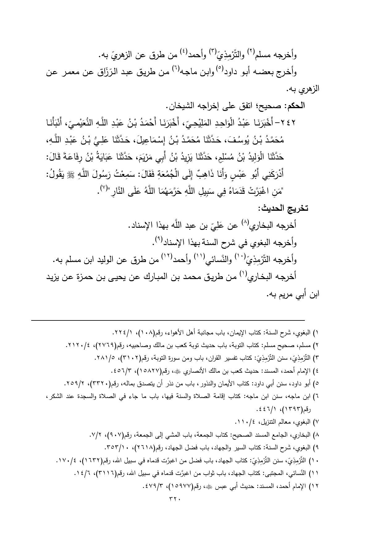 242 - أَخْبَرَنَا عَبْدُ الْوَاحِدِ المَلِيْحِيّ، أَخْبَرَنَا أَحْمَدُ بْنُ عَبْدِ اللَّهِ النُّعَيْميّ، أَنْبَأَنَا مُحَمَّدُ بْنُ يُوسُفَ، حَدَّثَنَا مُحَمَّدُ بْنُ إِسْمَاعِيلَ، حَدَّثَنَا عَلِيُّ بْنُ عَبْدِ اللَّهِ، حَدَّثَنَا الْوَلِيدُ بْنُ مُسْلِمٍ، حَدَّثَنَا يَزِيدُ بْنُ أَبِي مَرْيَمَ، حَدَّثَنَا عَبَايَةُ بْنُ رِفَاعَةَ قَالَ: أَدْرَكَنِي أَبُو عَبْسٍ وَأَنَا ذَاهِبٌ إِلَى الْجُمُعَةِ فَقَالَ: سَمِعْتُ رَسُولَ اللَّهِ - صلى الله عليه وسلم - يَقُولُ: "مَنِ اغْبَرَّتْ قَدَمَاهُ فِي سَبِيلِ اللَّهِ حَرَّمَهُمَا اللَّهُ عَلَى النَّارِ" (¬6).