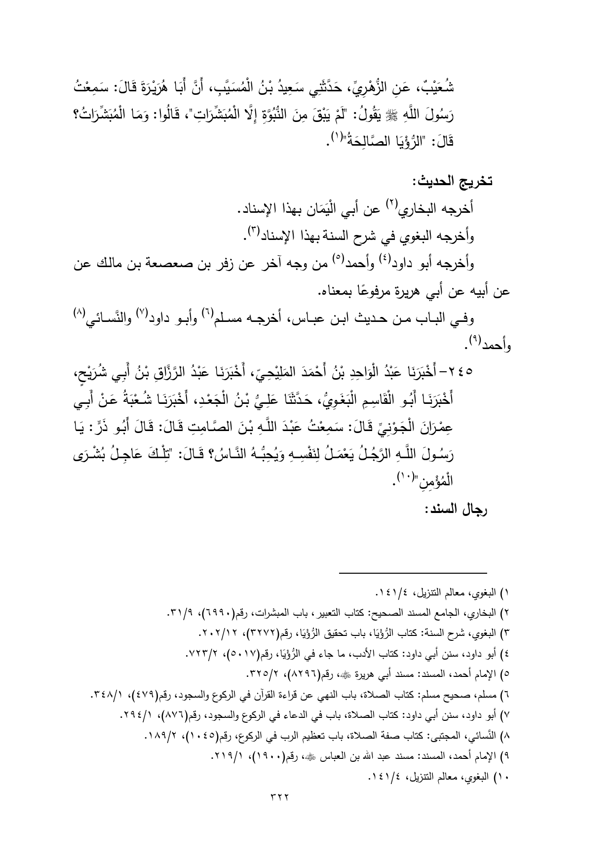(¬3) البغوي، شرح السنة: كتاب الرُّؤْيَا، باب تحقيق الرُّؤْيَا، رقم (3272)، 12/ 202.
