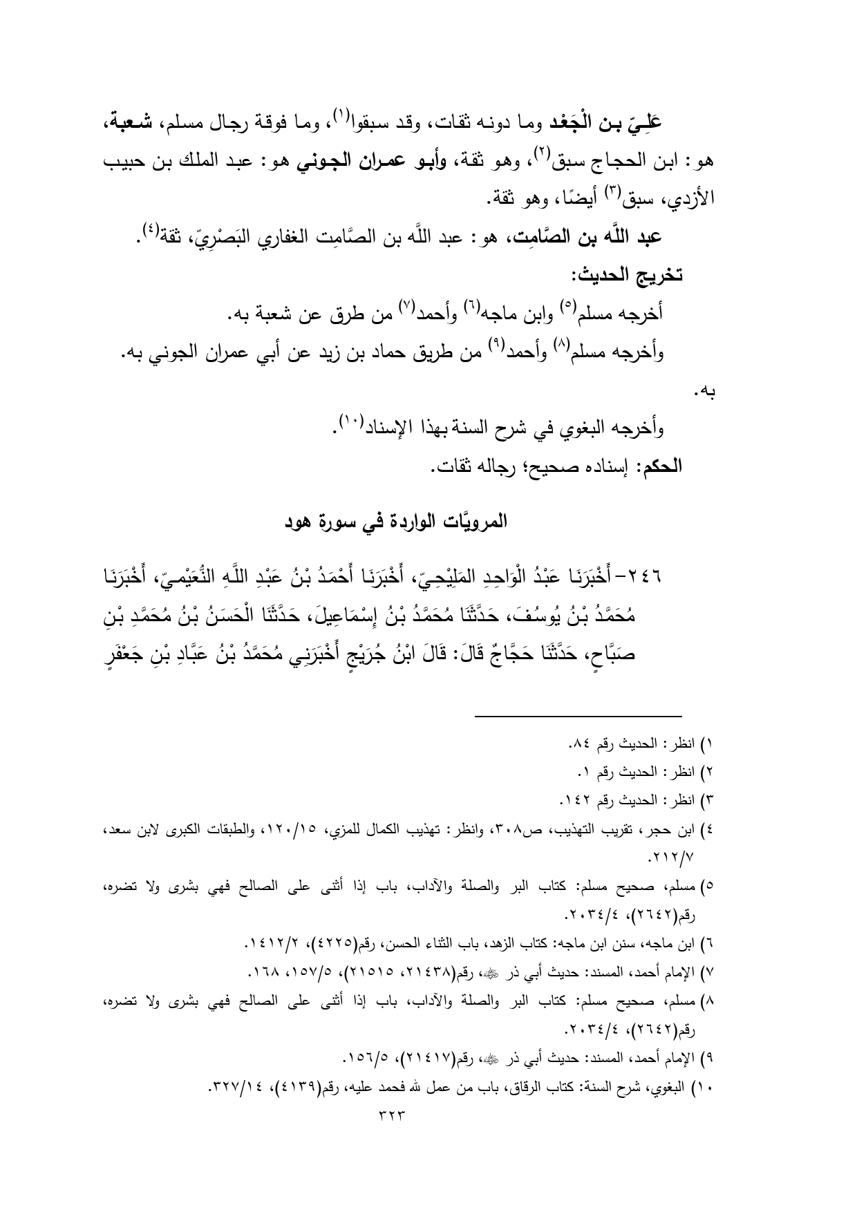 عَلِيّ بن الْجَعْد وما دونه ثقات، وقد سبقوا (¬1)، وما فوقة رجال مسلم، شعبة، هو: ابن الحجاج سبق (¬2)، وهو ثقة، وأبو عمران الجوني هو: عبد الملك بن حبيب الأزدي، سبق (¬3) أيضًا، وهو ثقة.