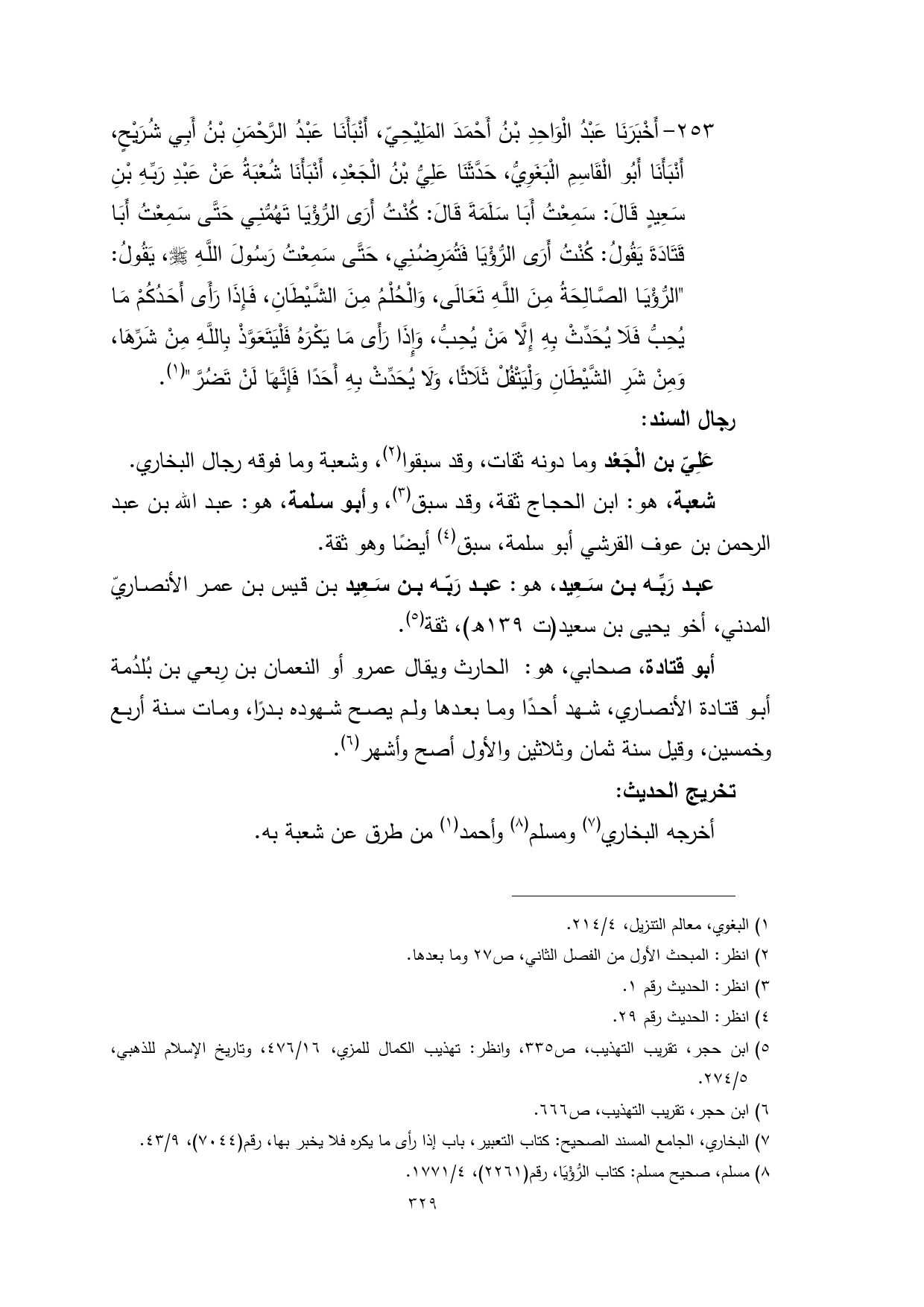 253 - أَخْبَرَنَا عَبْدُ الْوَاحِدِ بْنُ أَحْمَدَ المَلِيْحِيّ، أَنْبَأَنَا عَبْدُ الرَّحْمَنِ بْنُ أَبِي شُرَيْحٍ، أَنْبَأَنَا أَبُو الْقَاسِمِ الْبَغَوِيُّ، حَدَّثَنَا عَلِيُّ بْنُ الْجَعْدِ، أَنْبَأَنَا شُعْبَةُ عَنْ عَبْدِ رَبِّهِ بْنِ سَعِيدٍ قَالَ: سَمِعْتُ أَبَا سَلَمَةَ قَالَ: كُنْتُ أَرَى الرُّؤْيَا تَهُمُّنِي حَتَّى سَمِعْتُ أَبَا قَتَادَةَ يَقُولُ: كُنْتُ أَرَى الرُّؤْيَا فَتُمَرِضُنِي، حَتَّى سَمِعْتُ رَسُولَ اللَّهِ - صلى الله عليه وسلم -، يَقُولُ: "الرُّؤْيَا الصَّالِحَةُ مِنَ اللَّهِ تَعَالَى، وَالْحُلْمُ مِنَ الشَّيْطَانِ، فَإِذَا رَأَى أَحَدُكُمْ مَا يُحِبُّ فَلَا يُحَدِّثْ بِهِ إِلَّا مَنْ يُحِبُّ، وَإِذَا رَأَى مَا يَكْرَهُ فَلْيَتَعَوَّذْ بِاللَّهِ مِنْ شَرِّهَا، وَمِنْ شَرِ الشَّيْطَانِ وَلْيَتْفُلْ ثَلَاثًا، وَلَا يُحَدِّثْ بِهِ أَحَدًا فَإِنَّهَا لَنْ تَضُرَّ" (¬1).