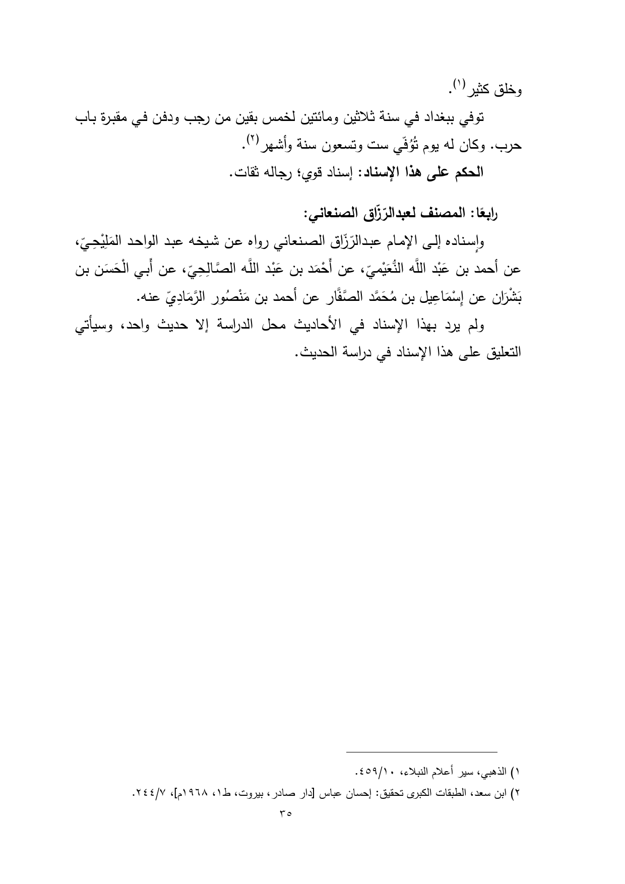 وإسناده إلى الإمام عبدالرّزّاق الصنعاني رواه عن شيخه عبد الواحد المَلِيْحِيّ، عن أحمد بن عَبْد اللَّه النُّعَيْميّ، عن أَحْمَد بن عَبْد اللَّه الصَّالِحِيّ، عن أَبي الْحَسَن بن بَشْرَان عن إِسْمَاعِيل بن مُحَمَّد الصَّفَّار عن أحمد بن مَنْصُور الرَّمَادِيّ عنه.