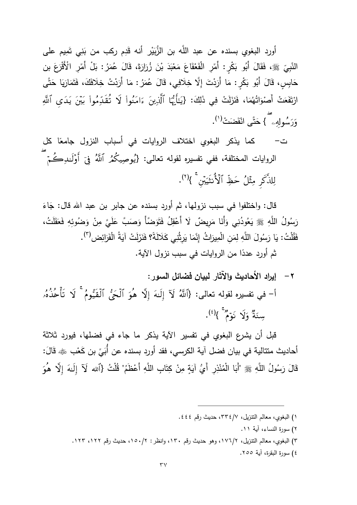 ت كما يذكر البغوي اختلاف الروايات في أسباب النزول جامعًا كل الروايات المختلفة، ففي تفسيره لقوله تعالى: {يُوصِيكُمُ اللَّهُ فِي أَوْلَادِكُمْ لِلذَّكَرِ مِثْلُ حَظِّ الْأُنْثَيَيْنِ {(¬2).