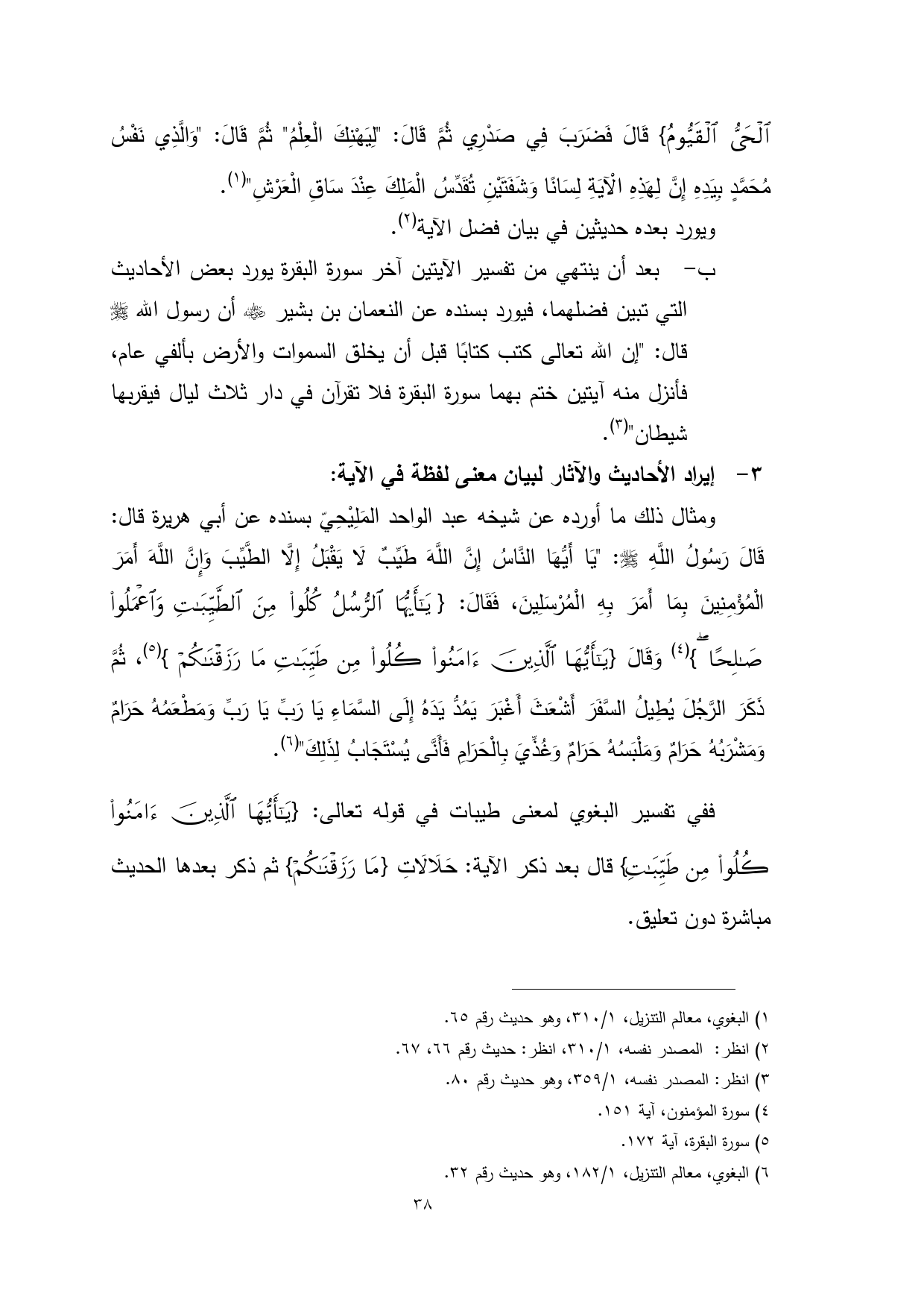 ففي تفسير البغوي لمعنى طيبات في قوله تعالى: {يَا أَيُّهَا الَّذِينَ آَمَنُوا كُلُوا مِنْ طَيِّبَاتِ} قال بعد ذكر الآية: حَلَالَاتِ {مَا رَزَقْنَاكُمْ} ثم ذكر بعدها الحديث مباشرة دون تعليق.