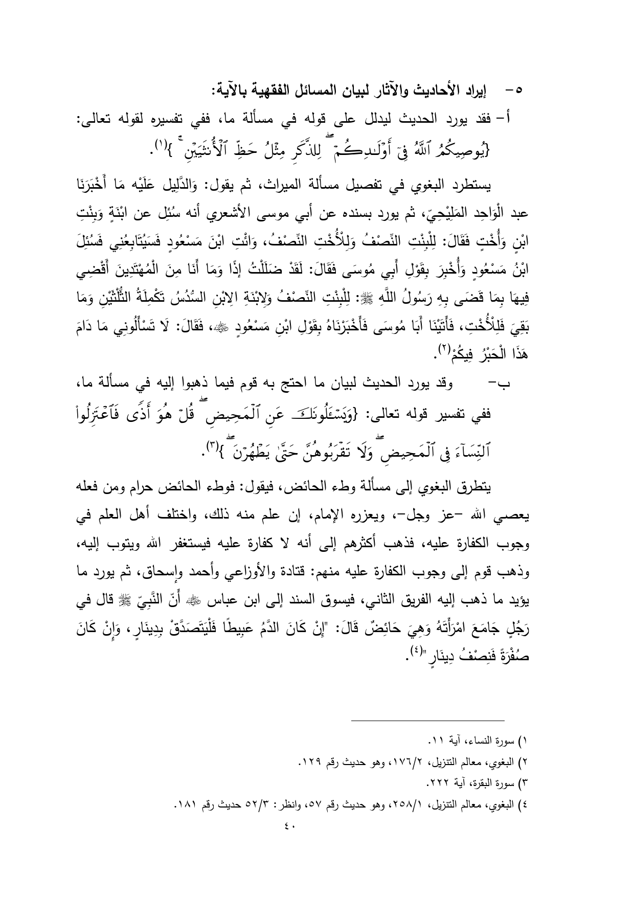 يتطرق البغوي إلى مسألة وطء الحائض، فيقول: فوطء الحائض حرام ومن فعله يعصي الله -عز وجل-، ويعزره الإمام، إن علم منه ذلك، واختلف أهل العلم في وجوب الكفارة عليه، فذهب أكثرهم إلى أنه لا كفارة عليه فيستغفر الله ويتوب إليه، وذهب قوم إلى وجوب الكفارة عليه منهم: قتادة والأوزاعي وأحمد وإسحاق، ثم يورد ما يؤيد ما ذهب إليه الفريق الثاني، فيسوق السند إلى ابن عباس - رضي الله عنه - أَنّ النَّبِيّ - صلى الله عليه وسلم - قال في رَجُلٍ جَامَعَ امْرَأَتَهُ وَهِيَ حَائِضٌ قَالَ: "إِنْ كَانَ الدَّمُ عَبِيطًا فَلْيَتَصَدَّقْ بِدِينَارٍ، وَإِنْ كَانَ صُفْرَةً فَنِصْفُ دِينَارٍ" (¬4).