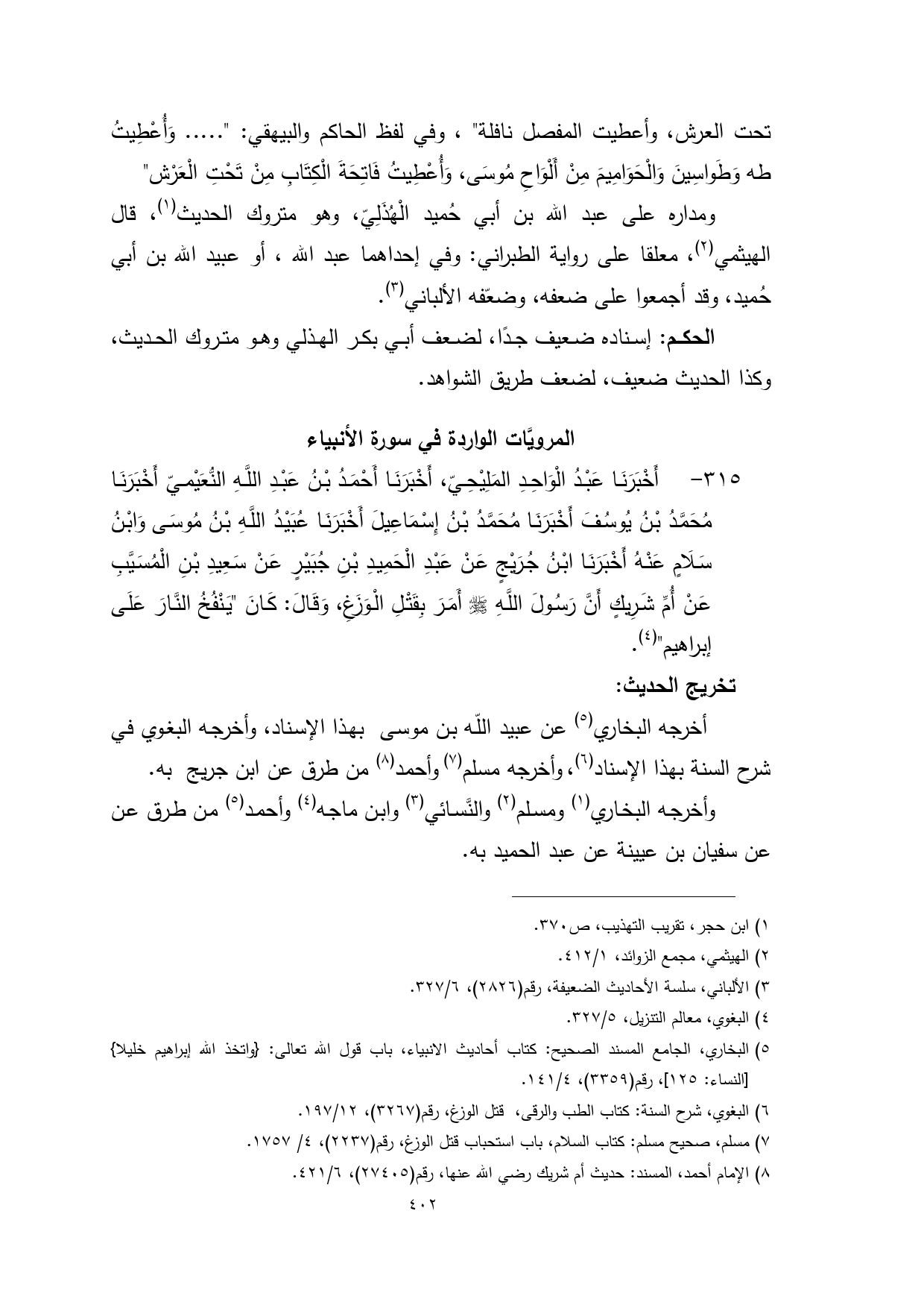 315 - أَخْبَرَنَا عَبْدُ الْوَاحِدِ المَلِيْحِيّ، أَخْبَرَنَا أَحْمَدُ بْنُ عَبْدِ اللَّهِ النُّعَيْميّ أَخْبَرَنَا مُحَمَّدُ بْنُ يُوسُفَ أَخْبَرَنَا مُحَمَّدُ بْنُ إِسْمَاعِيلَ أَخْبَرَنَا عُبَيْدُ اللَّهِ بْنُ مُوسَى وَابْنُ سَلَامٍ عَنْهُ أَخْبَرَنَا ابْنُ جُرَيْجٍ عَنْ عَبْدِ الْحَمِيدِ بْنِ جُبَيْرٍ عَنْ سَعِيدِ بْنِ الْمُسَيَّبِ عَنْ أُمِّ شَرِيكٍ أَنَّ رَسُولَ اللَّهِ - صلى الله عليه وسلم - أَمَرَ بِقَتْلِ الْوَزَغِ، وَقَالَ: كَانَ "يَنْفُخُ النَّارَ عَلَى إبراهيم" (¬4).