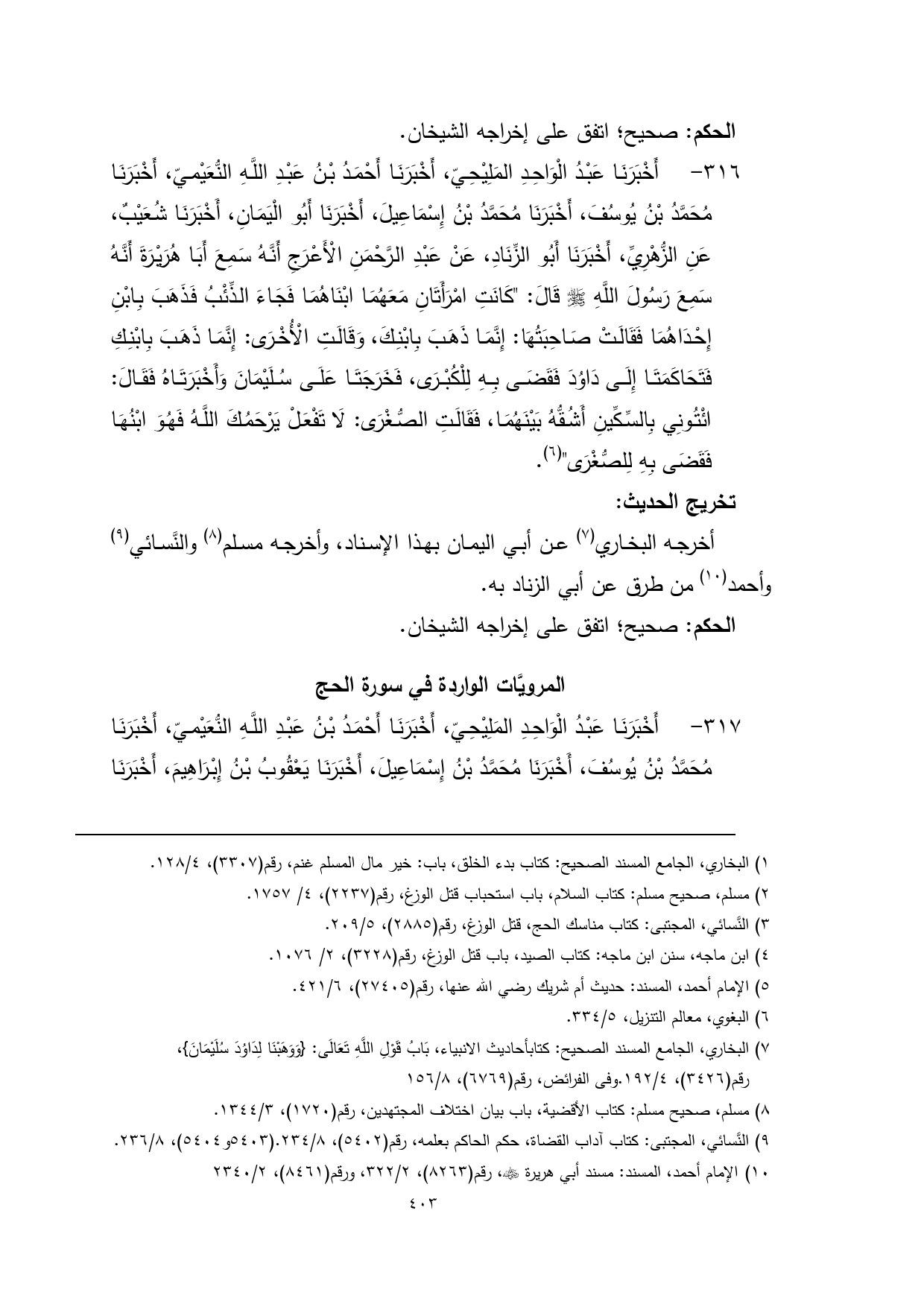 316 - أَخْبَرَنَا عَبْدُ الْوَاحِدِ المَلِيْحِيّ، أَخْبَرَنَا أَحْمَدُ بْنُ عَبْدِ اللَّهِ النُّعَيْميّ، أَخْبَرَنَا مُحَمَّدُ بْنُ يُوسُفَ، أَخْبَرَنَا مُحَمَّدُ بْنُ إِسْمَاعِيلَ، أَخْبَرَنَا أَبُو الْيَمَانِ، أَخْبَرَنَا شُعَيْبٌ، عَنِ الزُّهْرِيِّ، أَخْبَرَنَا أَبُو الزِّنَادِ، عَنْ عَبْدِ الرَّحْمَنِ الْأَعْرَجِ أَنَّهُ سَمِعَ أَبَا هُرَيْرَةَ أَنَّهُ سَمِعَ رَسُولَ اللَّهِ - صلى الله عليه وسلم - قَالَ: "كَانَتِ امْرَأَتَانِ مَعَهُمَا ابْنَاهُمَا فَجَاءَ الذِّئْبُ فَذَهَبَ بِابْنِ إِحْدَاهُمَا فَقَالَتْ صَاحِبَتُهَا: إِنَّمَا ذَهَبَ بِابْنِكَ، وَقَالَتِ الْأُخْرَى: إِنَّمَا ذَهَبَ بِابْنِكِ فَتَحَاكَمَتَا إِلَى دَاوُدَ فَقَضَى بِهِ لِلْكُبْرَى، فَخَرَجَتَا عَلَى سُلَيْمَانَ وَأَخْبَرَتَاهُ فَقَالَ: ائْتُونِي بِالسِّكِّينِ أَشُقُّهُ بَيْنَهُمَا، فَقَالَتِ الصُّغْرَى: لَا تَفْعَلْ يَرْحَمُكَ اللَّهُ فَهُوَ ابْنُهَا فَقَضَى بِهِ لِلصُّغْرَى" (¬1).