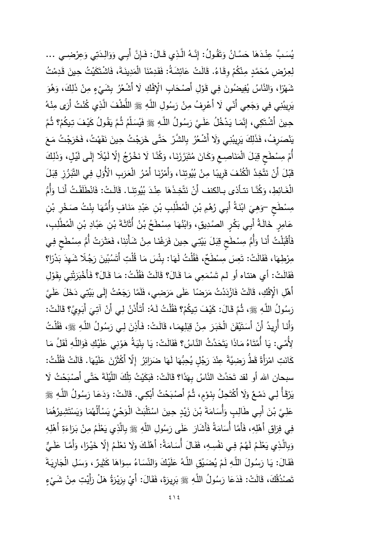 يُسَبَّ عِنْدَهَا حَسَّانُ وَتَقُولُ: إِنَّهُ الَّذِي قَالَ: فَإِنَّ أَبِي وَوَالِدَتِي وَعِرْضِي ... لِعِرْضِ مُحَمَّدٍ مِنْكُمْ وِقَاءُ. قَالَتْ عَائِشَةُ: فَقَدِمْنَا الْمَدِينَةَ، فَاشْتَكَيْتُ حِينَ قَدِمْتُ شَهْرًا، وَالنَّاسُ يُفِيضُونَ فِي قَوْلِ أَصْحَابِ الْإِفْكِ لَا أَشْعُرُ بِشَيْءٍ مِنْ ذَلِكَ، وَهُوَ يَرِيبُنِي فِي وَجَعِي أَنِّي لَا أَعْرِفُ مِنْ رَسُولِ اللَّهِ - صلى الله عليه وسلم - اللُّطْفَ الَّذِي كُنْتُ أَرَى مِنْهُ حِينَ أَشْتَكِي، إِنَّمَا يَدْخُلُ عَلَيَّ رَسُولُ اللَّهِ - صلى الله عليه وسلم - فَيُسَلِّمُ ثُمَّ يَقُولُ كَيْفَ تِيكُمْ؟ ثُمَّ يَنْصَرِفُ، فَذَلِكَ يَرِيبُنِي وَلَا أَشْعُرُ بِالشَّرِّ حَتَّى خَرَجْتُ حِينَ نَقَهْتُ، فَخَرَجْتُ مَعَ أُمِّ مِسْطَحٍ قِبَلَ الْمَنَاصِعِ وَكَانَ مُتَبَرَّزَنَا، وَكُنَّا لَا نَخْرُجُ إِلَّا لَيْلًا إِلَى لَيْلٍ، وَذَلِكَ قَبْلَ أَنْ نَتَّخِذَ الْكُنُفَ قَرِيبًا مِنْ بُيُوتِنَا، وَأَمْرُنَا أَمْرُ الْعَرَبِ الْأُوَلِ فِي التَّبَرُّزِ قِبَلَ الْغَائِطِ، وَكُنَّا نتأذى بالكنف أَنْ نَتَّخِذَهَا عِنْدَ بُيُوتِنَا. قَالَتْ: فَانْطَلَقْتُ أَنَا وَأُمُّ مِسْطَحٍ -وَهِيَ ابْنَةُ أَبِي رُهْمِ بْنِ الْمُطَّلِبِ بْنِ عَبْدِ مَنَافٍ وَأُمُّهَا بِنْتُ صَخْرِ بْنِ عَامِرٍ خَالَةُ أَبِي بَكْرٍ الصَّدِيقِ، وَابْنُهَا مِسْطَحُ بْنُ أُثَاثَةَ بْنِ عَبَّادِ بْنِ الْمُطَّلِبِ، فَأَقْبَلْتُ أَنَا وَأُمُّ مِسْطَحٍ قِبَلَ بَيْتِي حِينَ فَرَغْنَا مِنْ شَأْنِنَا، فَعَثَرَتْ أُمُّ مِسْطَحٍ فِي مِرْطِهَا، فَقَالَتْ: تَعِسَ مِسْطَحٌ، فَقُلْتُ لَهَا: بِئْسَ مَا قُلْتِ أَتَسُبِّينَ رَجُلًا شَهِدَ بَدْرًا؟ فَقَالَتْ: أي هنتاه أو لم تَسْمَعِي مَا قَالَ؟ قَالَتْ فَقُلْتُ: مَا قَالَ؟ فَأَخْبَرَتْنِي بِقَوْلِ أَهْلِ الْإِفْكِ، قَالَتْ فَازْدَدْتُ مَرَضًا عَلَى مَرَضِي، فَلَمَّا رَجَعْتُ إِلَى بَيْتِي دَخَلَ عَلَيَّ رَسُولُ اللَّهِ - صلى الله عليه وسلم -، ثُمَّ قَالَ: كَيْفَ تِيكُمْ؟ فَقُلْتُ لَهُ: أَتَأْذَنُ لِي أَنْ آتِيَ أَبَوِيَّ؟ قَالَتْ: وَأَنَا أُرِيدُ أَنْ أَسَتَيْقَنَ الْخَبَرَ مِنْ قِبَلِهِمَا، قَالَتْ: فَأَذِنَ لِي رَسُولُ اللَّهِ - صلى الله عليه وسلم -، فَقُلْتُ لِأُمِّي: يَا أُمَّتَاهُ مَاذَا يَتَحَدَّثُ النَّاسُ؟ فَقَالَتْ: يَا بِنْيَةُ هَوِّنِي عَلَيْكِ فَوَاللَّهِ لَقَلَّ مَا كَانَتِ امْرَأَةً قَطُّ رَضِيَّةً عِنْدَ رَجُلٍ يُحِبُّهَا لَهَا ضَرَائِرُ إِلَّا أَكْثَرْنَ عَلَيْهَا. قَالَتْ فَقُلْتُ: سبحان الله أو لقد تَحَدَّثَ النَّاسُ بِهَذَا؟ قَالَتْ: فَبَكَيْتُ تِلْكَ اللَّيْلَةَ حَتَّى أَصْبَحْتُ لَا يَرْقَأُ لِي دَمْعٌ وَلَا أَكْتَحِلُ بِنَوْمٍ، ثُمَّ أَصْبَحْتُ أَبْكِي. قَالَتْ: وَدَعَا رَسُولُ اللَّهِ - صلى الله عليه وسلم - عَلِيَّ بْنَ أَبِي طَالِبٍ وَأُسَامَةَ بْنَ زَيْدٍ حِينَ اسْتَلْبَثَ الْوَحْيُ يَسْأَلُهُمَا وَيَسْتَشِيرُهُمَا فِي فِرَاقِ أَهْلِهِ، فَأَمَّا أُسَامَةُ فَأَشَارَ عَلَى رَسُولِ اللَّهِ - صلى الله عليه وسلم - بِالَّذِي يَعْلَمُ مِنْ بَرَاءَةِ أَهْلِهِ وَبِالَّذِي يَعْلَمُ لَهُمْ فِي نَفْسِهِ، فَقَالَ أُسَامَةُ: أَهْلَكَ وَلَا نَعْلَمُ إِلَّا خَيْرًا، وَأَمَّا عَلَيٌّ فَقَالَ: يَا رَسُولَ اللَّهِ لَمْ يُضَيِّقِ اللَّهُ عَلَيْكَ وَالنِّسَاءُ سِوَاهَا كَثِيرٌ، وَسَلِ الْجَارِيَةَ تَصْدُقْكَ، قَالَتْ: فَدَعَا رَسُولُ اللَّهِ - صلى الله عليه وسلم - بَرِيرَةَ، فَقَالَ: أَيْ بِرَيْرَةُ هَلْ رَأَيْتِ مِنْ شَيْءٍ