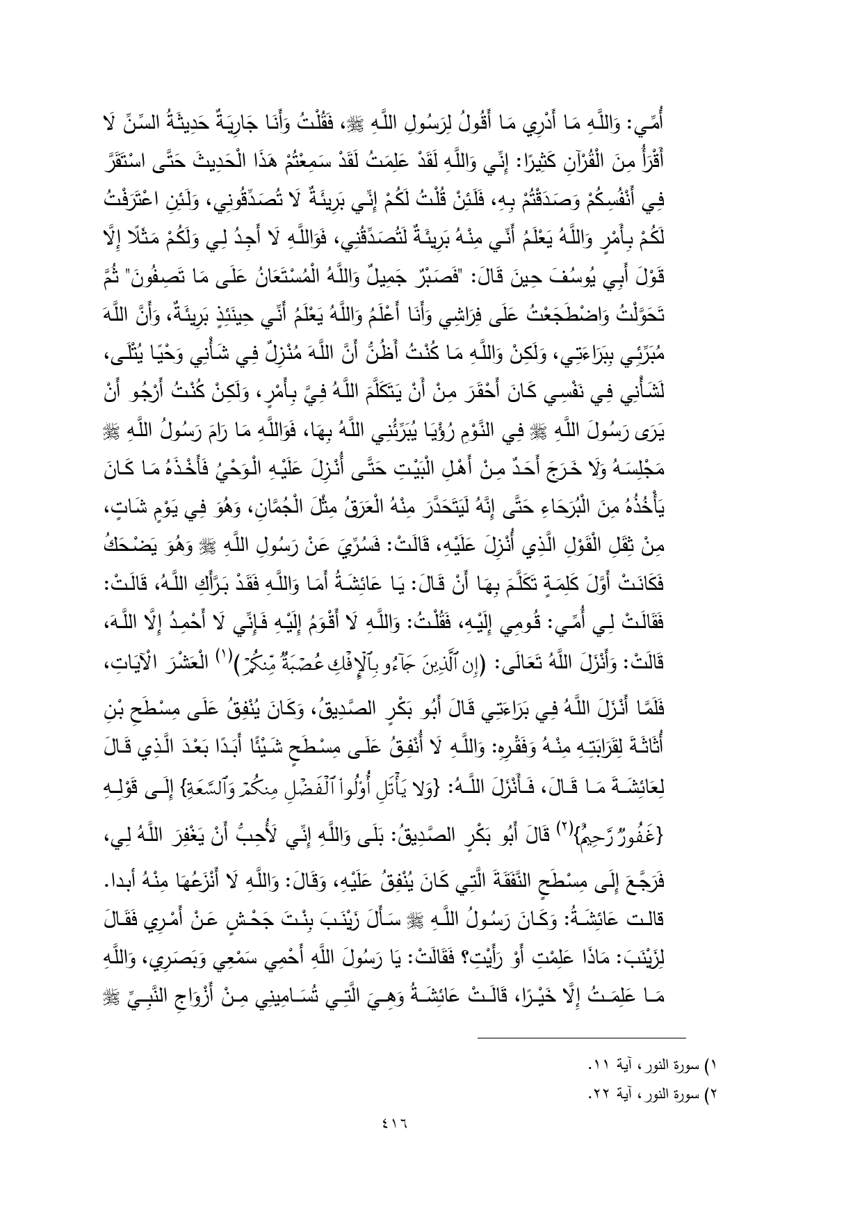 أُمِّي: وَاللَّهِ مَا أَدْرِي مَا أَقُولُ لِرَسُولِ اللَّهِ - صلى الله عليه وسلم -، فَقُلْتُ وَأَنَا جَارِيَةٌ حَدِيثَةُ السِّنِّ لَا أَقْرَأُ مِنَ الْقُرْآنِ كَثِيرًا: إِنِّي وَاللَّهِ لَقَدْ عَلِمَتُ لَقَدْ سَمِعْتُمْ هَذَا الْحَدِيثَ حَتَّى اسْتَقَرَّ فِي أَنْفُسِكُمْ وَصَدَقْتُمْ بِهِ، فَلَئِنْ قُلْتُ لَكُمْ إِنِّي بَرِيئَةٌ لَا تُصَدِّقُونِي، وَلَئِنِ اعْتَرَفْتُ لَكُمْ بِأَمْرٍ وَاللَّهُ يَعْلَمُ أَنِّي مِنْهُ بَرِيئَةٌ لَتُصَدِّقُنِي، فَوَاللَّهِ لَا أَجِدُ لِي وَلَكُمْ مَثَلًا إِلَّا قَوْلَ أَبِي يُوسُفَ حِينَ قَالَ: "فَصَبْرٌ جَمِيلٌ وَاللَّهُ الْمُسْتَعَانُ عَلَى مَا تَصِفُونَ" ثُمَّ تَحَوَّلْتُ وَاضْطَجَعْتُ عَلَى فِرَاشِي وَأَنَا أَعْلَمُ وَاللَّهُ يَعْلَمُ أَنِّي حِينَئِذٍ بَرِيئَةٌ، وَأَنَّ اللَّهَ مُبَرِّئِي بِبَرَاءَتِي، وَلَكِنْ وَاللَّهِ مَا كُنْتُ أَظُنُّ أَنَّ اللَّهَ مُنْزِلٌ فِي شَأْنِي وَحْيًا يُتْلَى، لَشَأْنِي فِي نَفْسِي كَانَ أَحْقَرَ مِنْ أَنْ يَتَكَلَّمَ اللَّهُ فِيَّ بِأَمْرٍ، وَلَكِنْ كُنْتُ أَرْجُو أَنْ يَرَى رَسُولَ اللَّهِ - صلى الله عليه وسلم - فِي النَّوْمِ رُؤْيَا يُبَرِّئُنِي اللَّهُ بِهَا، فَوَاللَّهِ مَا رَامَ رَسُولُ اللَّهِ - صلى الله عليه وسلم - مَجْلِسَهُ وَلَا خَرَجَ أَحَدٌ مِنْ أَهْلِ الْبَيْتِ حَتَّى أُنْزِلَ عَلَيْهِ الْوَحْيُ فَأَخْذَهُ مَا كَانَ