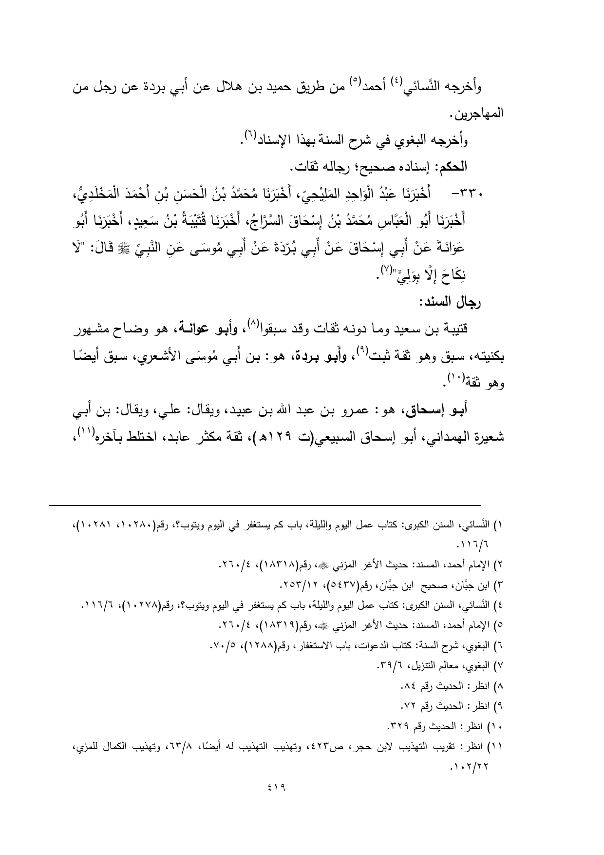 330 - أَخْبَرَنَا عَبْدُ الْوَاحِدِ المَلِيْحِيّ، أَخْبَرَنَا مُحَمَّدُ بْنُ الْحَسَنِ بْنِ أَحْمَدَ الْمَخْلَدِيُّ، أَخْبَرَنَا أَبُو الْعَبَّاسِ مُحَمَّدُ بْنُ إِسْحَاقَ السَّرَّاجُ، أَخْبَرَنَا قُتَيْبَةُ بْنُ سَعِيدٍ، أَخْبَرَنَا أَبُو عَوَانَةَ عَنْ أَبِي إِسْحَاقَ عَنْ أَبِي بُرْدَةَ عَنْ أَبِي مُوسَى عَنِ النَّبِيِّ - صلى الله عليه وسلم - قَالَ: "لَا نِكَاحَ إِلَّا بِوَلِيٍّ" (¬4).