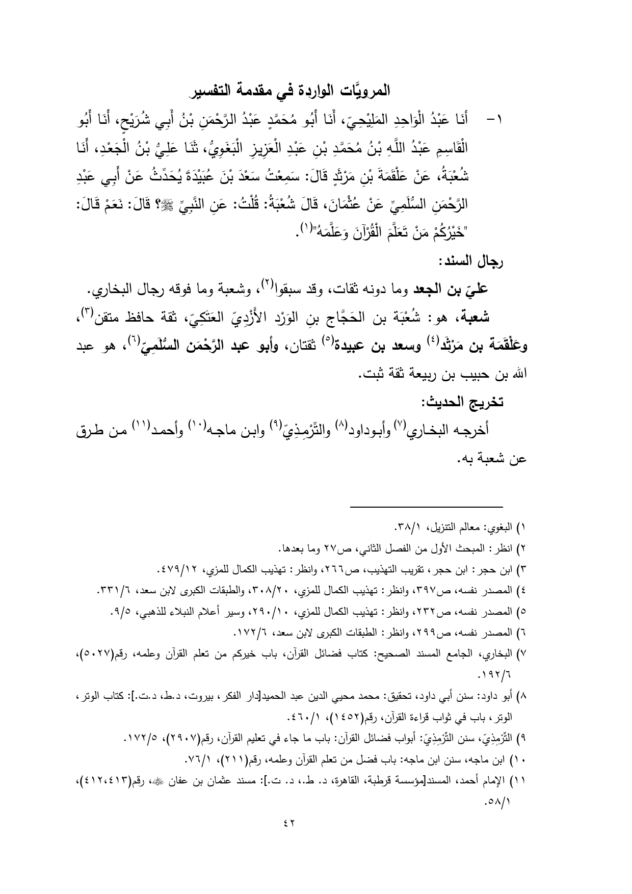 1 - أنَا عَبْدُ الْوَاحِدِ المَلِيْحِيّ، أَنَا أَبُو مُحَمَّدٍ عَبْدُ الرَّحْمَنِ بْنُ أَبِي شُرَيْحٍ، أَنَا أَبُو الْقَاسِمِ عَبْدُ اللَّهِ بْنُ مُحَمَّدِ بْنِ عَبْدِ الْعَزِيزِ الْبَغَوِيُّ، ثَنَا عَلِيُّ بْنُ الْجَعْدِ، أَنَا شُعْبَةُ، عَنْ عَلْقَمَةَ بْنِ مَرْثَدٍ قَالَ: سَمِعْتُ سَعْدَ بْنَ عُبَيْدَةَ يُحَدِّثُ عَنْ أَبِي عَبْدِ الرَّحْمَنِ السُّلَمِيِّ عَنْ عُثْمَانَ، قَالَ شُعْبَةُ: قُلْتُ: عَنِ النَّبِيِّ - صلى الله عليه وسلم -؟ قَالَ: نَعَمْ قَالَ: "خَيْرُكُمْ مَنْ تَعَلَّمَ الْقُرْآنَ وَعَلَّمَهُ" (¬1).