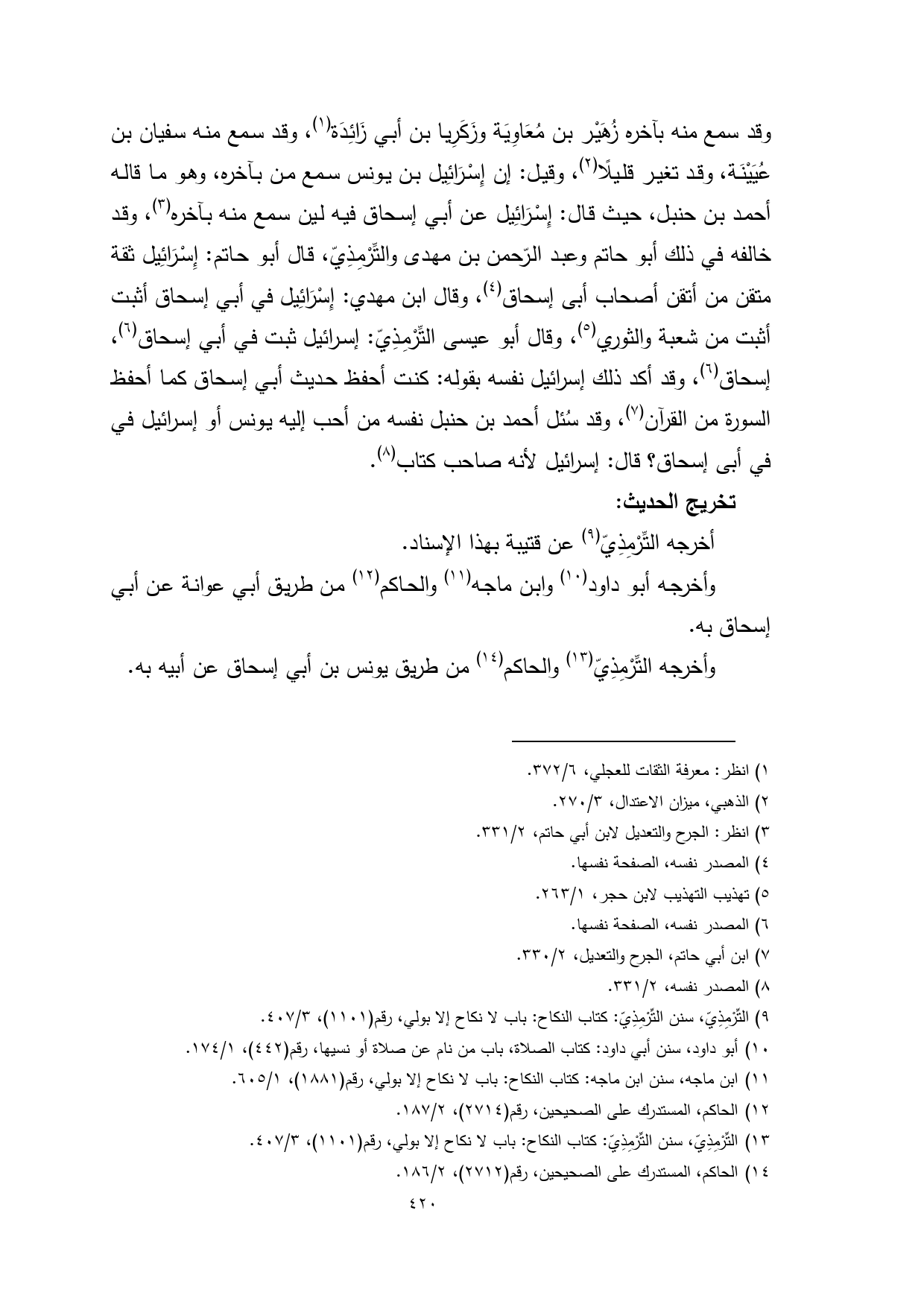 وقد سمع منه بآخره زُهَيْر بن مُعَاوِيَة وزَكَرِيا بن أبي زَائِدَة (¬1)، وقد سمع منه سفيان بن عُيَيْنَة، وقد تغير قليلًا (¬2)، وقيل: إن إِسْرَائِيل بن يونس سمع من بآخره، وهو ما قاله أحمد بن حنبل، حيث قال: إِسْرَائِيل عن أبي إسحاق فيه لين سمع منه بآخره (¬3)، وقد خالفه في ذلك أبو حاتم وعبد الرّحمن بن مهدى والتِّرْمِذِيّ، قال أبو حاتم: إِسْرَائِيل ثقة متقن من أتقن أصحاب أبى إسحاق (¬4)، وقال ابن مهدي: إِسْرَائِيل في أبي إسحاق أثبت من شعبة والثوري (¬5)، وقال أبو عيسى التِّرْمِذِيّ: إسرائيل ثبت في أبي إسحاق (¬6)، وقد أكد ذلك إسرائيل نفسه بقوله: كنت أحفظ حديث أبي إسحاق كما أحفظ السورة من القرآن (¬7)، وقد سُئل أحمد بن حنبل نفسه من أحب إليه يونس أو إسرائيل في أبى إسحاق؟ قال: إسرائيل لأنه صاحب كتاب (¬8).