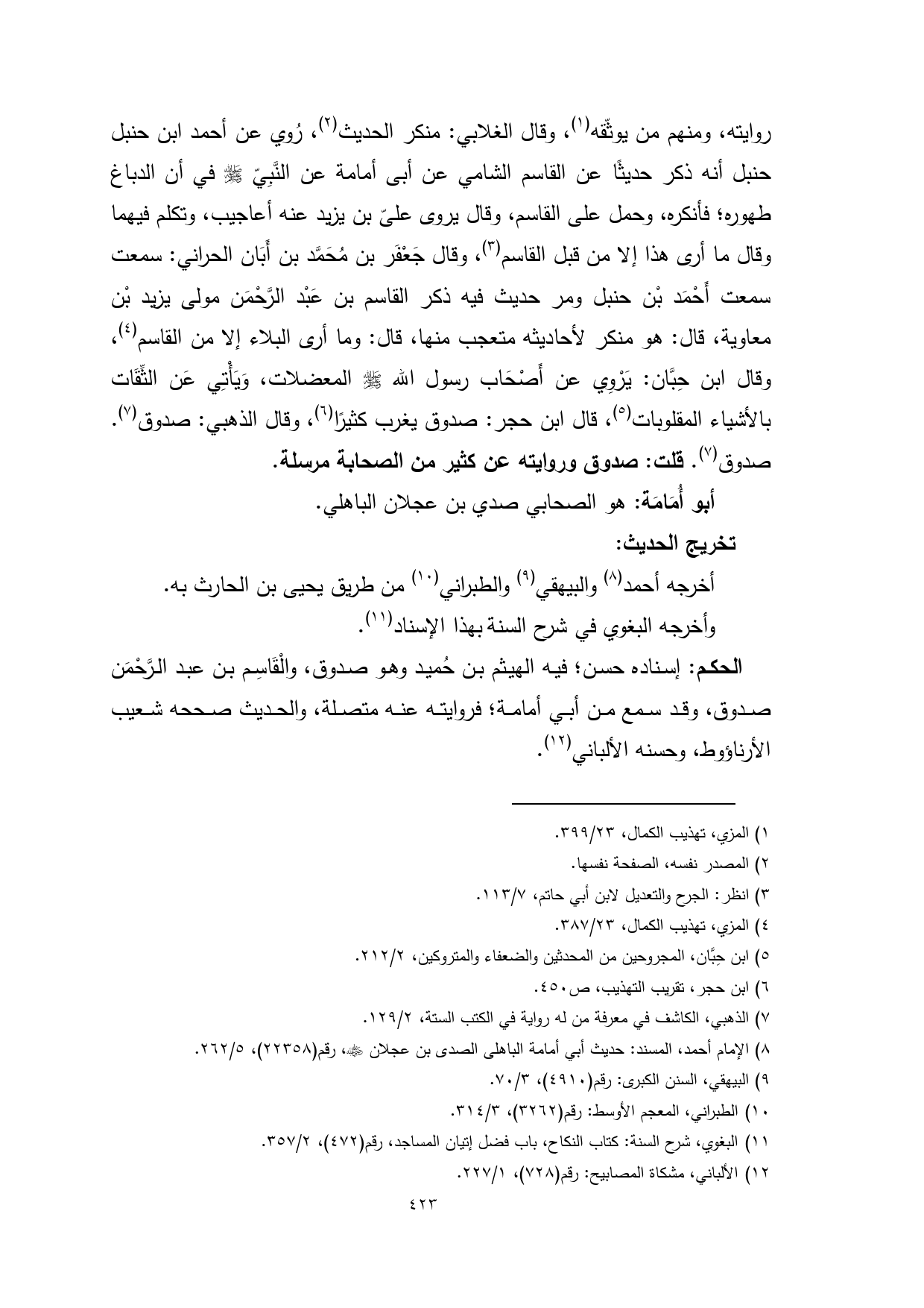 الحكم: إسناده حسن؛ فيه الهيثم بن حُميد وهو صدوق، والْقَاسِم بن عبد الرَّحْمَن صدوق، وقد سمع من أبي أمامة؛ فروايته عنه متصلة، والحديث صححه شعيب الأرناؤوط، وحسنه الألباني (¬12).