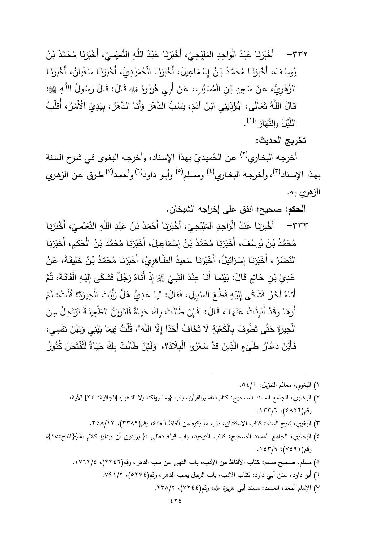 332 - أَخْبَرَنَا عَبْدُ الْوَاحِدِ المَلِيْحِيّ، أَخْبَرَنَا عَبْدُ اللَّهِ النُّعَيْميّ، أَخْبَرَنَا مُحَمَّدُ بْنُ يُوسُفَ، أَخْبَرَنَا مُحَمَّدُ بْنُ إِسْمَاعِيلَ، أَخْبَرَنَا الْحُمَيْدِيُّ، أَخْبَرَنَا سُفْيَانُ، أَخْبَرَنَا الزُّهْرِيُّ، عَنْ سَعِيدِ بْنِ الْمُسَيَّبِ، عَنْ أَبِي هُرَيْرَةَ - رضي الله عنه - قَالَ: قَالَ رَسُولُ اللَّهِ - صلى الله عليه وسلم -: قَالَ اللَّهُ تَعَالَى: "يُؤْذِينِي ابْنُ آدَمَ، يَسُبُّ الدَّهْرَ وَأَنَا الدَّهْرُ، بِيَدِيَ الْأَمْرُ، أُقَلِّبُ اللَّيْلَ وَالنَّهَارَ" (¬1).