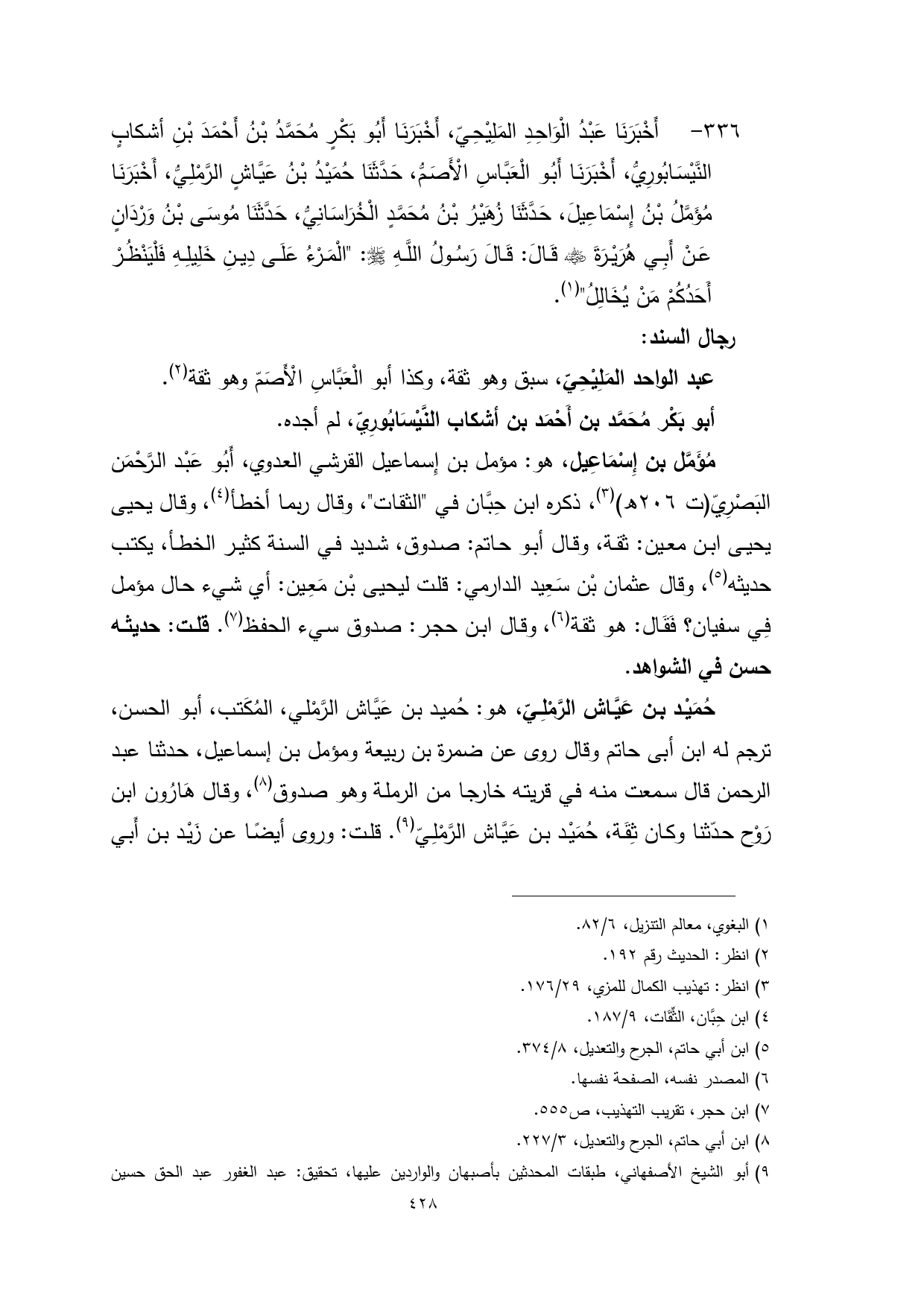 336 - أَخْبَرَنَا عَبْدُ الْوَاحِدِ المَلِيْحِيّ، أَخْبَرَنَا أَبُو بَكْرٍ مُحَمَّدُ بْنُ أَحْمَدَ بْنِ أشكابٍ النَّيْسَابُورِيُّ، أَخْبَرَنَا أَبُو الْعَبَّاسِ الْأَصَمُّ، حَدَّثَنَا حُمَيْدُ بْنُ عَيَّاشٍ الرَّمْلِيُّ، أَخْبَرَنَا مُؤَمَّلُ بْنُ إِسْمَاعِيلَ، حَدَّثَنَا زُهَيْرُ بْنُ مُحَمَّدٍ الْخُرَاسَانِيُّ، حَدَّثَنَا مُوسَى بْنُ وَرْدَانٍ عَنْ أَبِي هُرَيْرَةَ - رضي الله عنه - قَالَ: قَالَ رَسُولُ اللَّهِ - صلى الله عليه وسلم -: "الْمَرْءُ عَلَى دِينِ خَلِيلِهِ فَلْيَنْظُرْ أَحَدُكُمْ مَنْ يُخَالِلُ" (¬1).