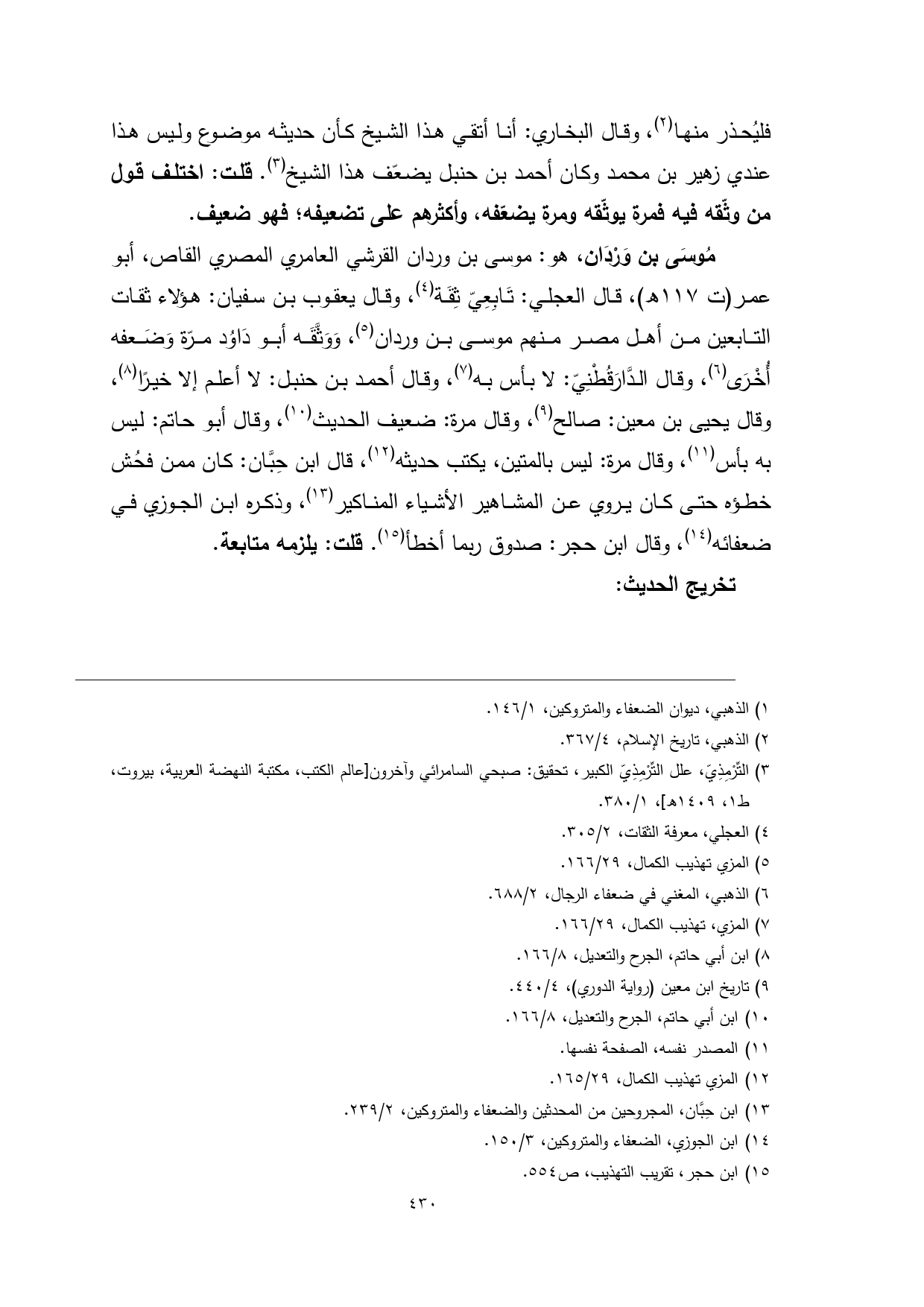 (¬2) التِّرْمِذِيّ، علل التِّرْمِذِيّ الكبير، تحقيق: صبحي السامرائي وآخرون] عالم الكتب, مكتبة النهضة العربية، بيروت، ط 1، 1409 هـ[، 1/ 380.