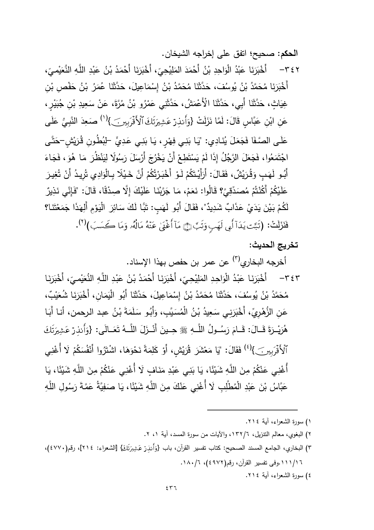 342 - أَخْبَرَنَا عَبْدُ الْوَاحِدِ بْنُ أَحْمَدَ المَلِيْحِيّ، أَخْبَرَنَا أَحْمَدُ بْنُ عَبْدِ اللَّهِ النُّعَيْميّ، أَخْبَرَنَا مُحَمَّدُ بْنُ يُوسُفَ، حَدَّثَنَا مُحَمَّدُ بْنُ إِسْمَاعِيلَ، حَدَّثَنَا عُمَرُ بْنُ حَفْصِ بْنِ غِيَاثٍ، حَدَّثَنَا أَبِي، حَدَّثَنَا الْأَعْمَشُ، حَدَّثَنِي عَمْرُو بْنُ مُرَّةَ، عَنْ سَعِيدِ بْنِ جُبَيْرٍ، عَنِ ابْنِ عَبَّاسٍ قَالَ: لَمَّا نَزَلَتْ {وَأَنْذِرْ عَشِيرَتَكَ الْأَقْرَبِينَ} (¬1) صَعِدَ النَّبِيُّ عَلَى الصَّفَا فَجَعَلَ يُنَادِي: "يَا بَنِي فِهْرٍ، يَا بَنِي عَدِيٍّ -لِبُطُونِ قُرَيْشٍ-حَتَّى اجْتَمَعُوا، فَجَعَلَ الرَّجُلُ إِذَا لَمْ يَسْتَطِعْ أَنْ يَخْرُجَ أَرْسَلَ رَسُولًا لِيَنْظُرَ مَا هُوَ، فَجَاءَ أَبُو لَهَبٍ وَقُرَيْشٌ، فَقَالَ: أَرَأَيْتَكُمْ لَوْ أَخْبَرْتُكُمْ أَنَّ خَيْلًا بِالْوَادِي تُرِيدُ أَنْ تُغِيرَ عَلَيْكُمْ أَكُنْتُمْ مُصَدِّقِيَّ؟ قَالُوا: نَعَمْ، مَا جَرَّبْنَا عَلَيْكَ إِلَّا صِدْقًا، قَالَ: "فَإِنِّي نَذِيرٌ لَكُمْ بَيْنَ يَدَيْ عَذَابٌ شَدِيدٌ"، فَقَالَ أَبُو لَهَبٍ: تَبًّا لَكَ سَائِرَ الْيَوْمِ أَلِهَذَا جَمَعْتَنَا؟ فَنَزَلَتْ: {تَبَّتْ يَدَا أَبِي لَهَبٍ وَتَبَّ (1) مَا أَغْنَى عَنْهُ مَالُهُ وَمَا كَسَبَ} (¬2).