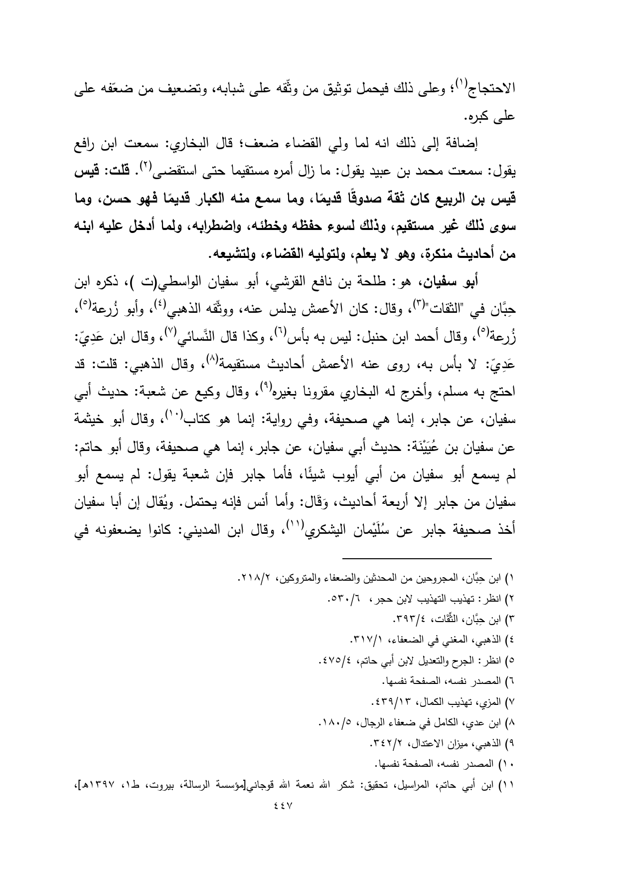 إضافة إلى ذلك انه لما ولي القضاء ضعف؛ قال البخاري: سمعت ابن رافع يقول: سمعت محمد بن عبيد يقول: ما زال أمره مستقيما حتى استقضى (¬2). قلت: قيس بن الربيع كان ثقة صدوقًا قديمًا، وما سمع منه الكبار قديمًا فهو حسن، وما سوى ذلك غير مستقيم، وذلك لسوء حفظه وخطئه، واضطرابه، ولما أدخل عليه ابنه من أحاديث منكرة، وهو لا يعلم، ولتوليه القضاء، ولتشيعه.